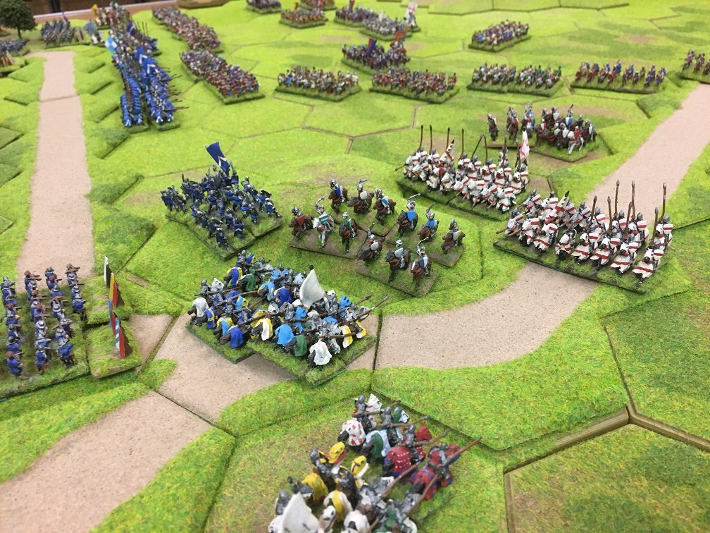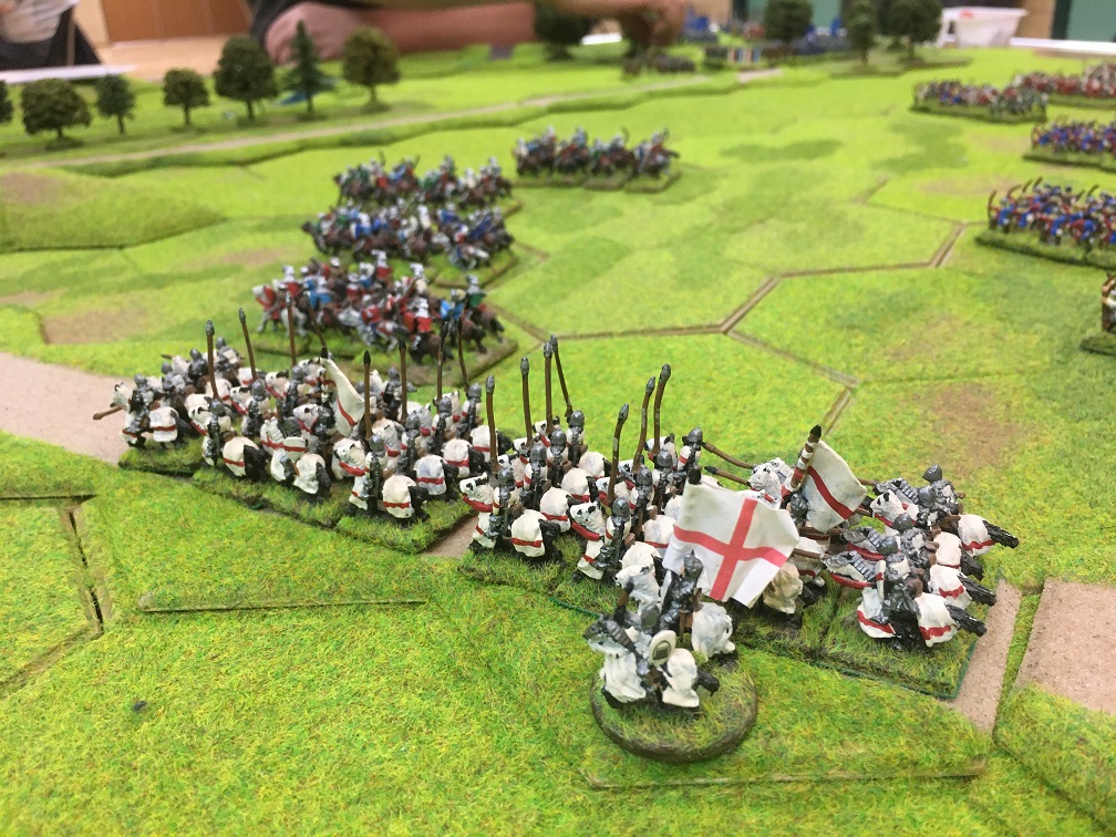 Chris was given the challenging task of racing to prevent Tim’s French crossing the bridge. He had 2 units of mounted men-at-arms (knights), 4 units of mounted sergeants and a general with which at maximum speed he managed to reach a small 3 hex hill overlooking the bridge but not block the bridge. As an aside, I remember thinking at this point that enlarging the game might just make the French mission somewhat easier!