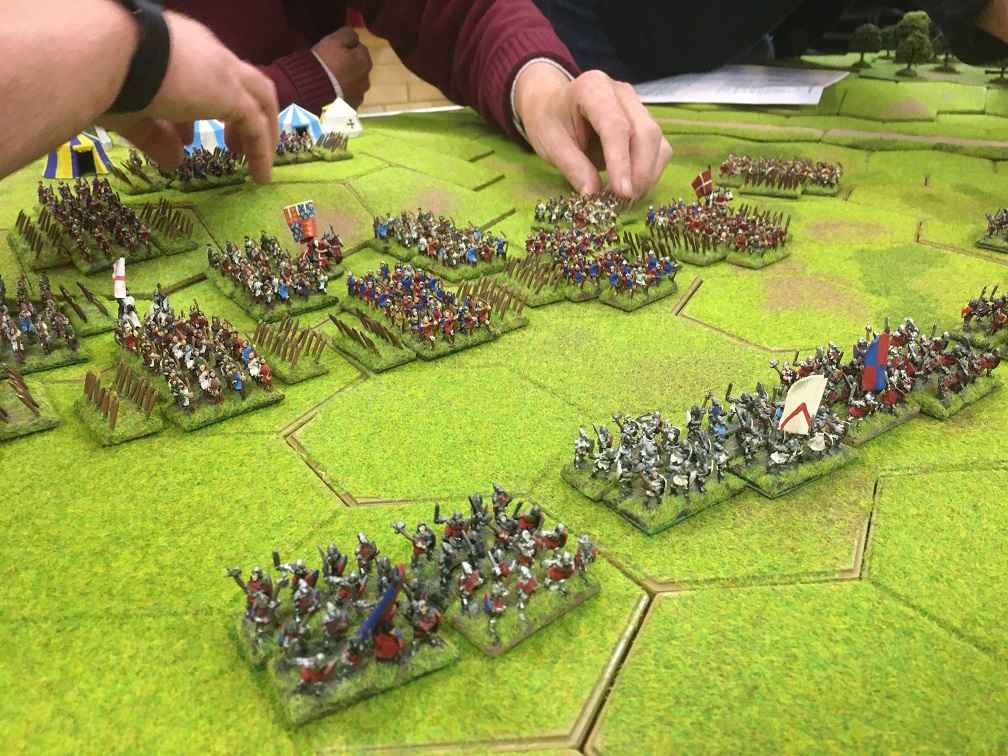 The first club game of 2022 was an enlarged version of the Skype Hundred Years War game which we played during the Christmas break. There were now 6 players and not 2 and so the playing area was extended from 6ft x 4ft to 8ft by 6ft, the English tented camp was enlarged and the distance from the English deployment zone to the bridge extended by 3 hexes. The size of both armies was also proportionately increased which gave the increased number of players more units to command along with the number of generals increased from 3 to 4 for both the English and French armies.