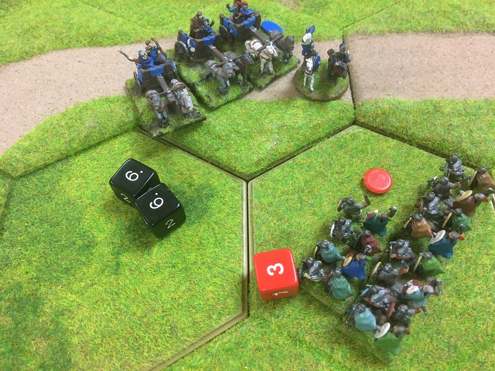 A unit of British chariots accompanied by a general was going through units of Saxon warriors like a giant scythe! It didn’t matter how many units we through against it, against the odds it won every combat, scattering the remnants of our fleeing warriors towards our table edge. The final dice roll of the game summed-up our efforts rather well – the chariot unit rolled a double 6 and our depleted and disrupted select fyrd unit rolled a 3! Game over.