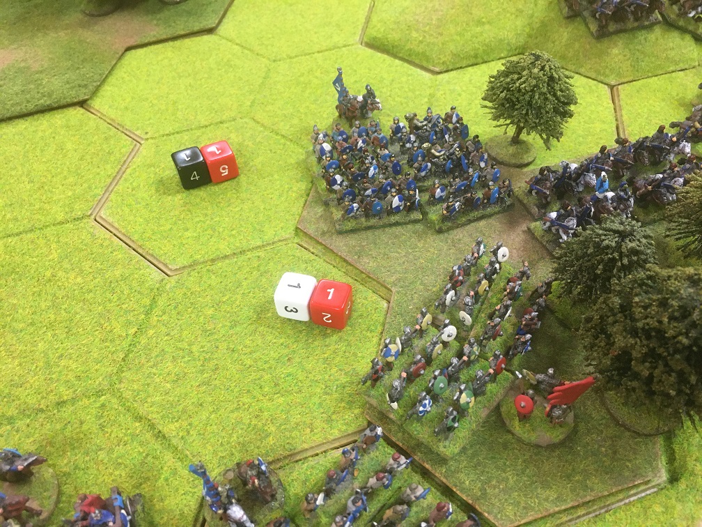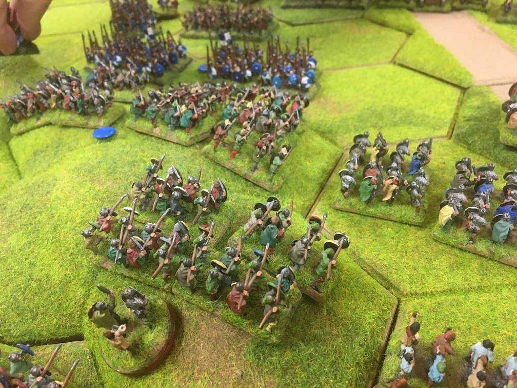 Opening moves saw both armies close on the centre line of the table. Tim’s Saxon hordes secured the aforementioned 8 hex escarpment thereby confronting Dave’s British spear units with a well defended steep sided slope. I slowly advanced 3 units of Saxon huscarls leading units of the greater fyrd warriors forward. Meanwhile Chris took possession of the area of woodland on the Saxon left straddling the road with his Saxon select fyrd units.