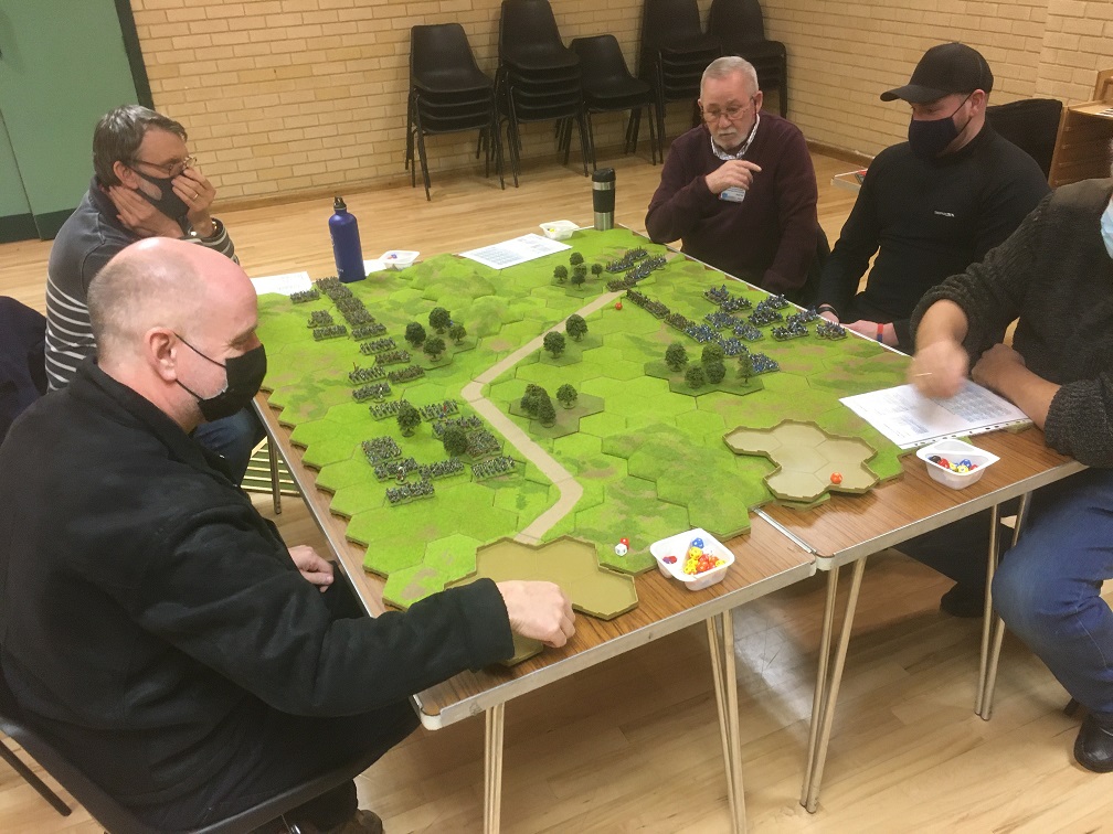 The dice dictated that Tony, James and Dave command the Brits and Chris, Tim and myself the Saxons. After the two British defeats the previous week they were definitely out for revenge! However, the Saxons won the dice roll for choice of table edge and second deployment which put us in a promising starting position with a very useful 8 hex escarpment securing the left wing of our battle line.