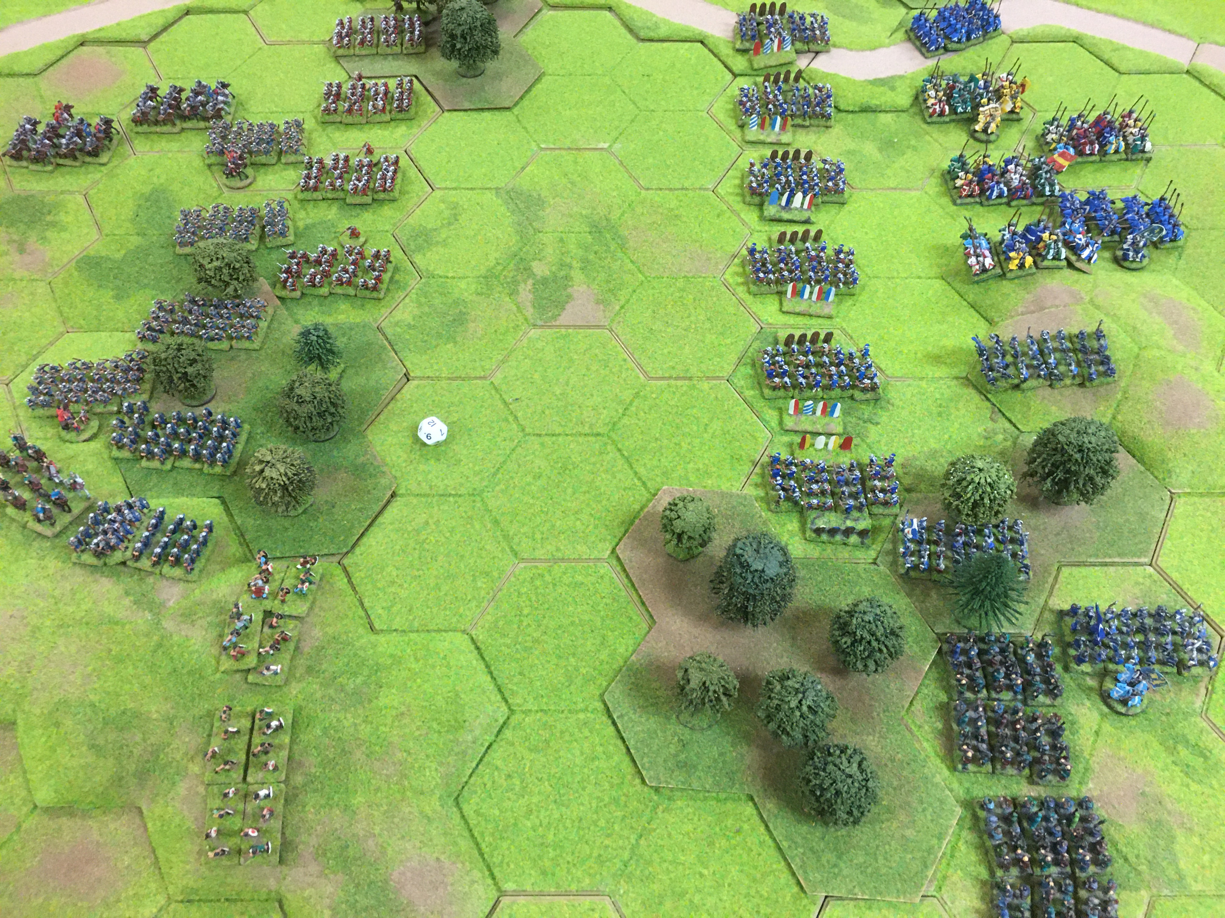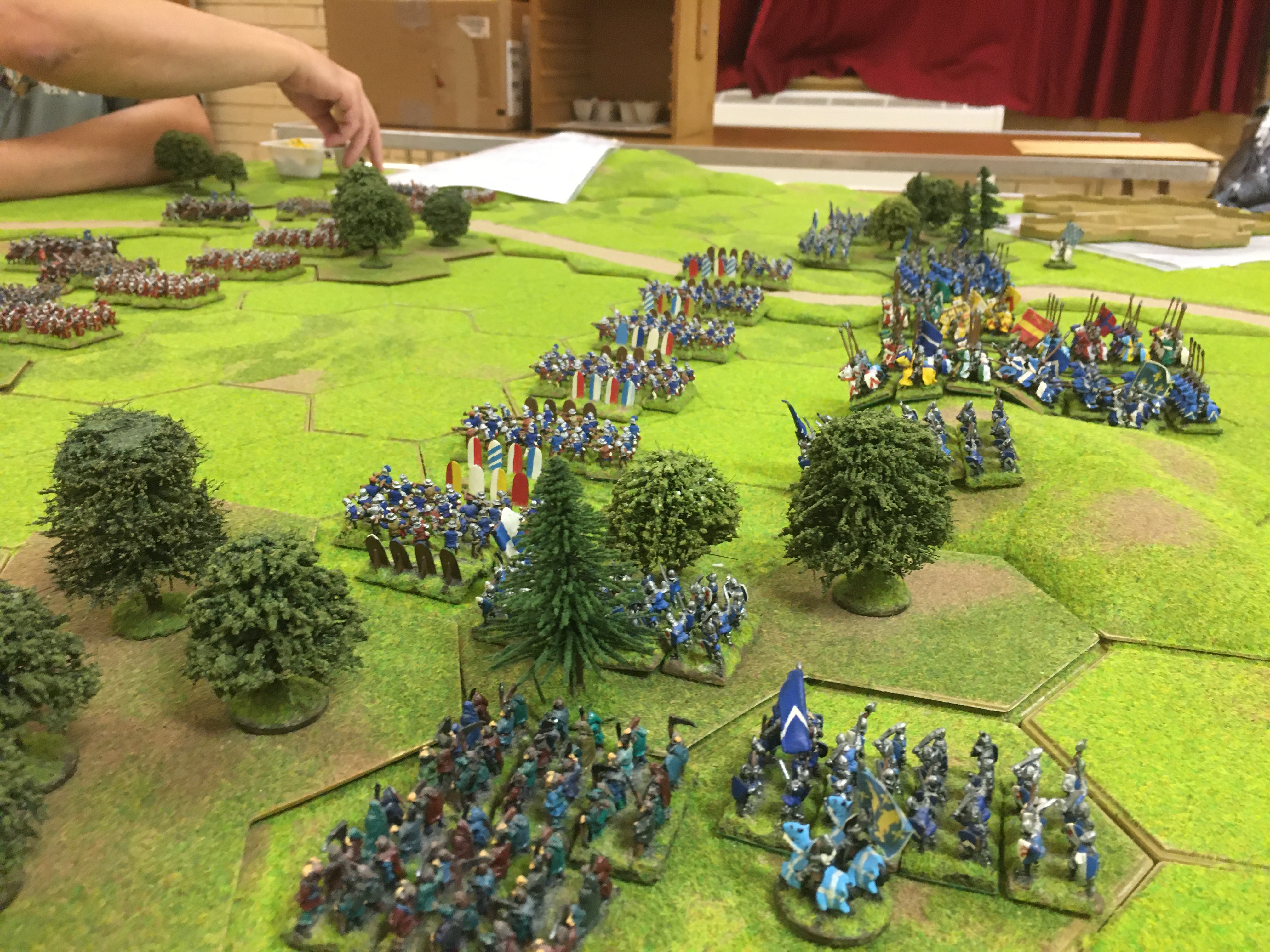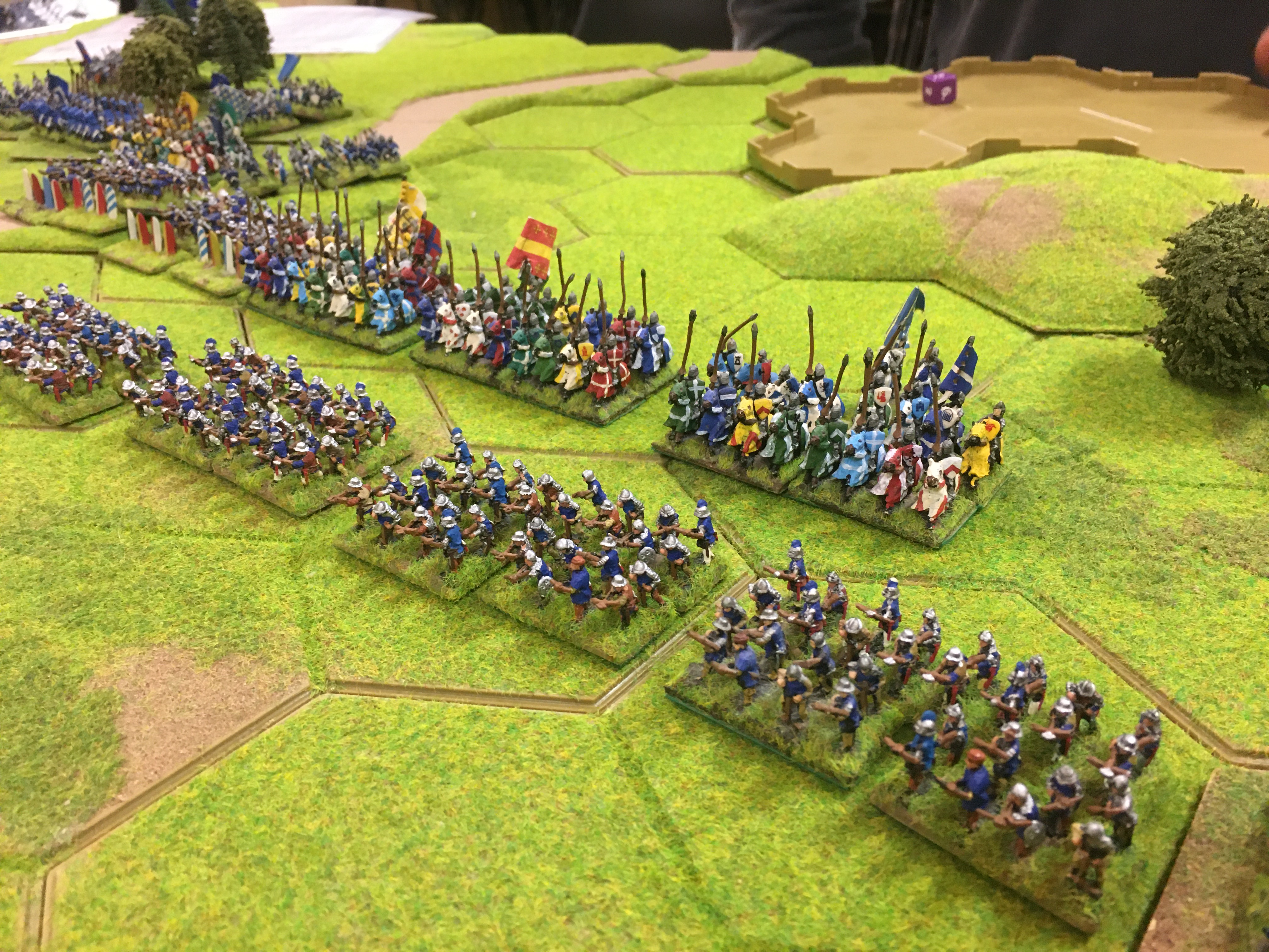 In the biggest gamble of the game I advanced the crossbow units into shooting range of the Roman legionary line. Because the crossbows were carrying their own pavisses they were not able to move and shoot in the same phase. This gave Chris three options for his Roman line; stand their ground and withstand the hail of crossbow bolts; pull the shield wall back one hex out of range; advance into combat with the crossbow line. Unfortunately, Chris chose the third option, the one we feared! This meant that the French crossbows needed to shoot well and to put it bluntly they didn’t. In fact they produced a pretty awful set of results. And, to add insult to injury Tony’s French cavalry, having successfully dispatched the Roman skirmishers and light cavalry found themselves halted by the Roman archers who found their French targets!