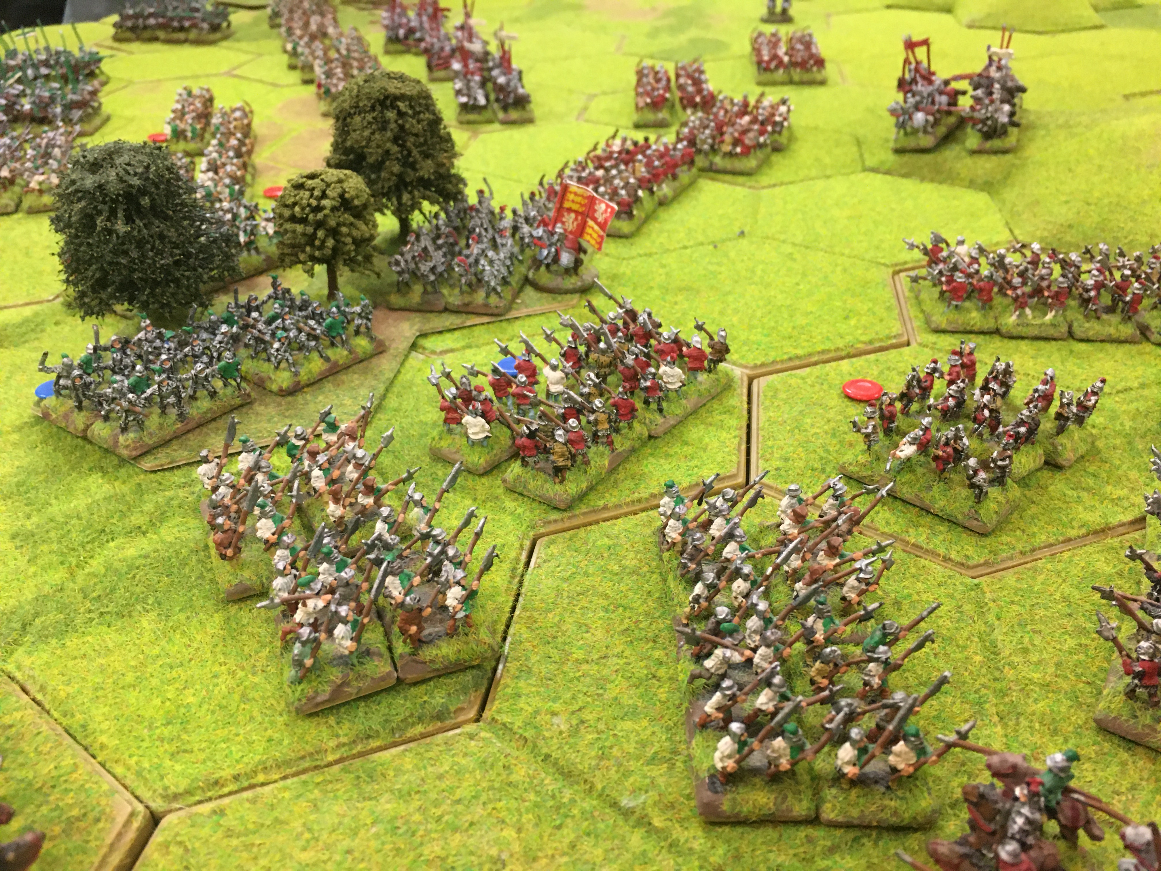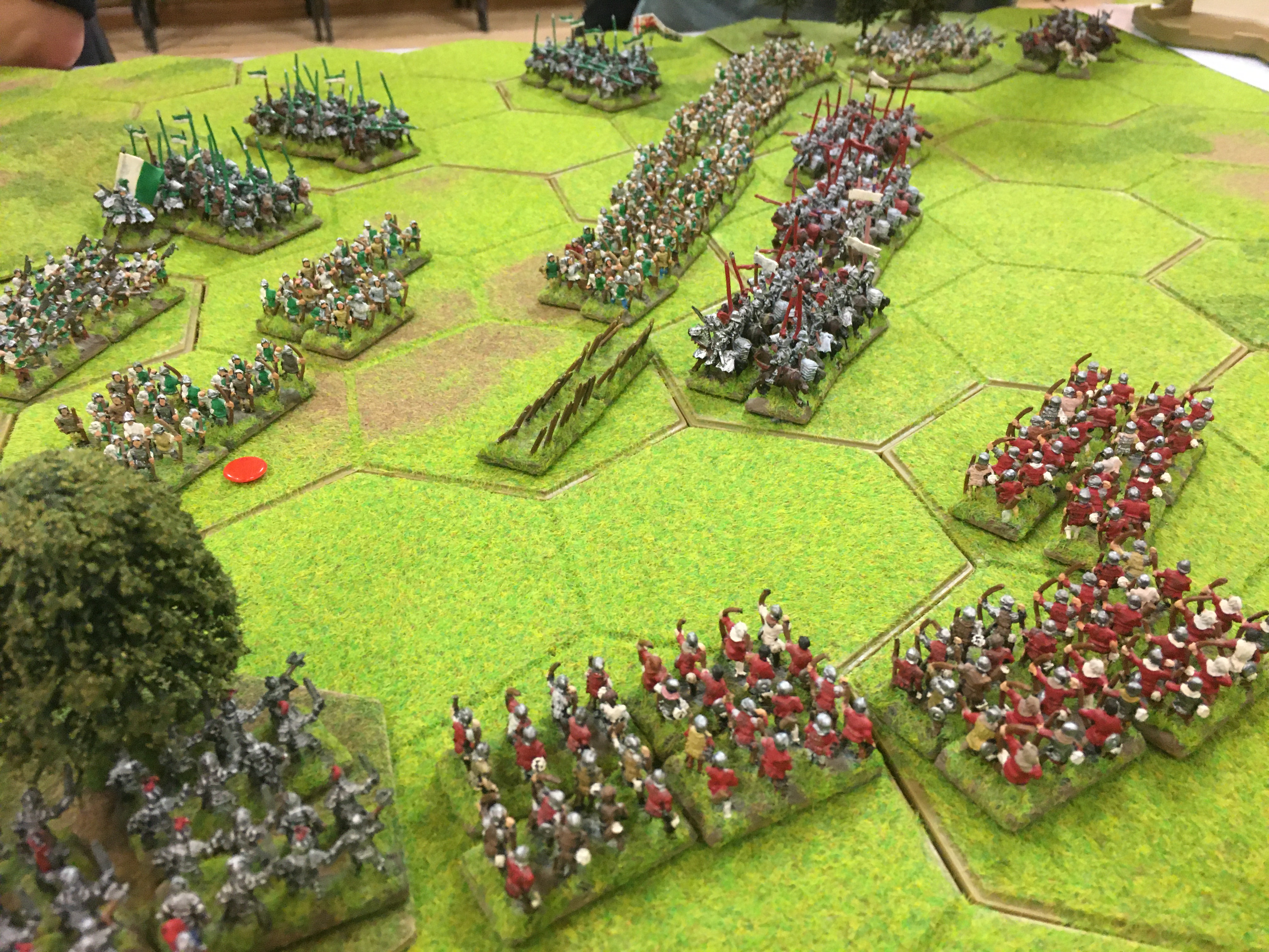 Tony positioned all but one of our mounted men-at-arms units behind our Lancastrian longbow and the threat of a charge made Chris cautious and he halted his advance and his longbow planted stakes. However, Tim through caution to the wind and charged his infantry and cavalry towards the central wood and my extreme left wing. In response to Tim’s attack I could either pull back into a strong defensive line or meet him head-on. I chose the latter!