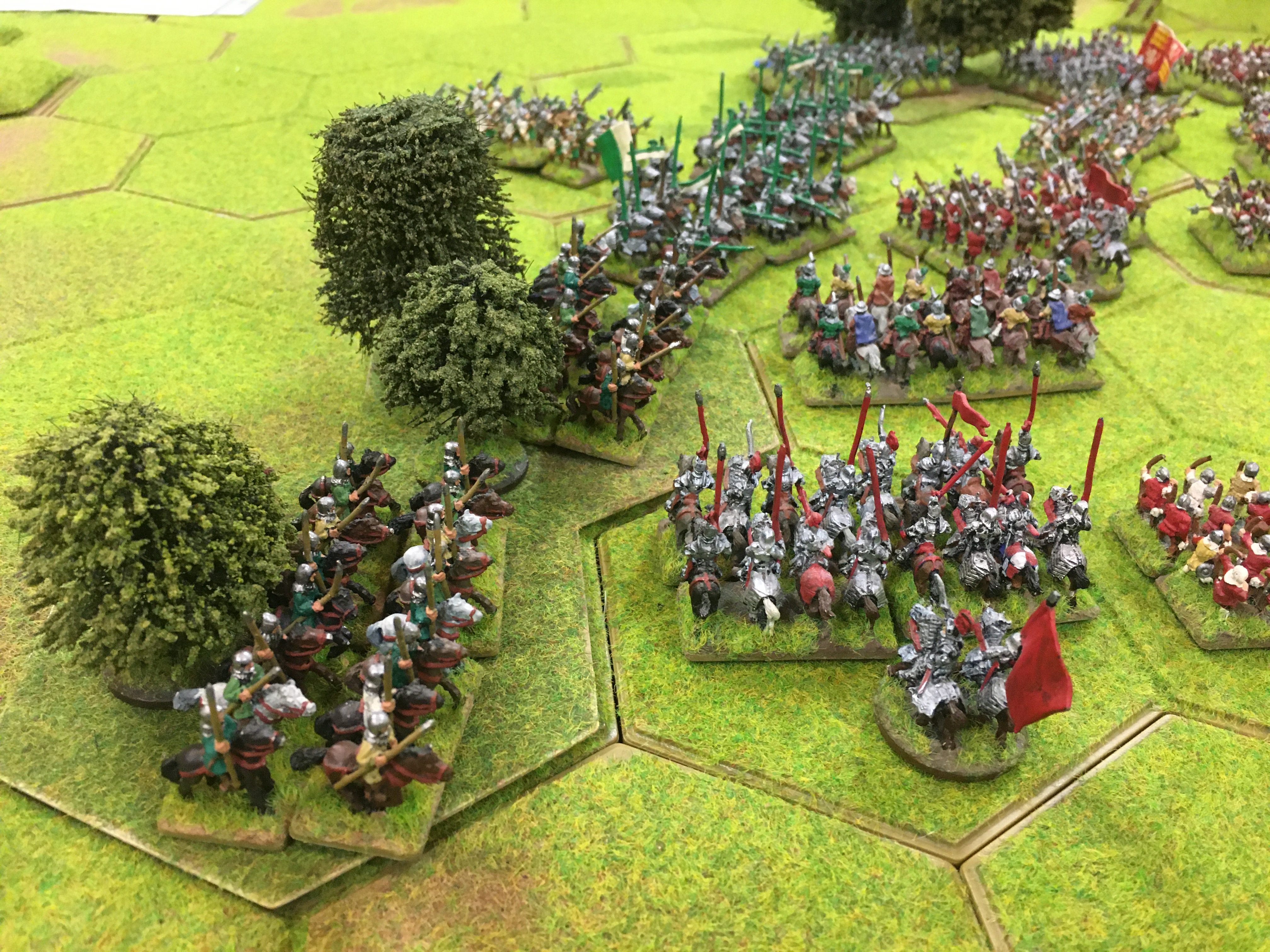 Meanwhile, Tony had managed to gain the upper-hand in the shooting match against Chris’s longbow forcing some recoils but was not yet ready to charge with his knights following up behind. We really needed possession of the central woodland to secure his flank before the charge went in. However, that was the task of my infantry which were making no headway into the wood and were being now thoroughly defeated on the left by Tim’s flanking attack.