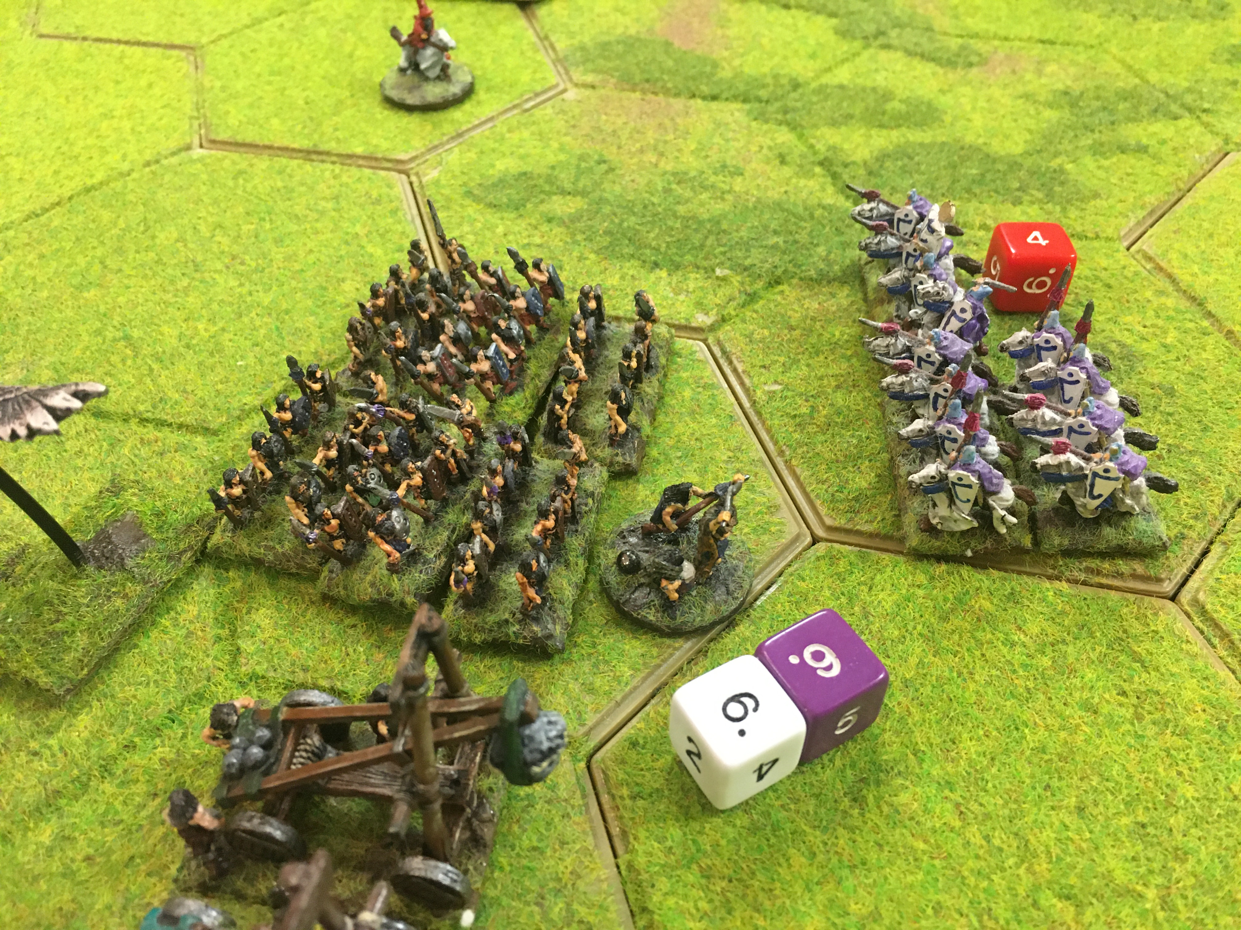 This game was best described as semi-organised chaos in which the roll of the dice pushed and pulled the fortunes of both sides in all directions throughout. A barbarian victory? Erm, I don’t think either side had more than a third of their army on the table at the conclusion of the game, but it was certainly entertaining!