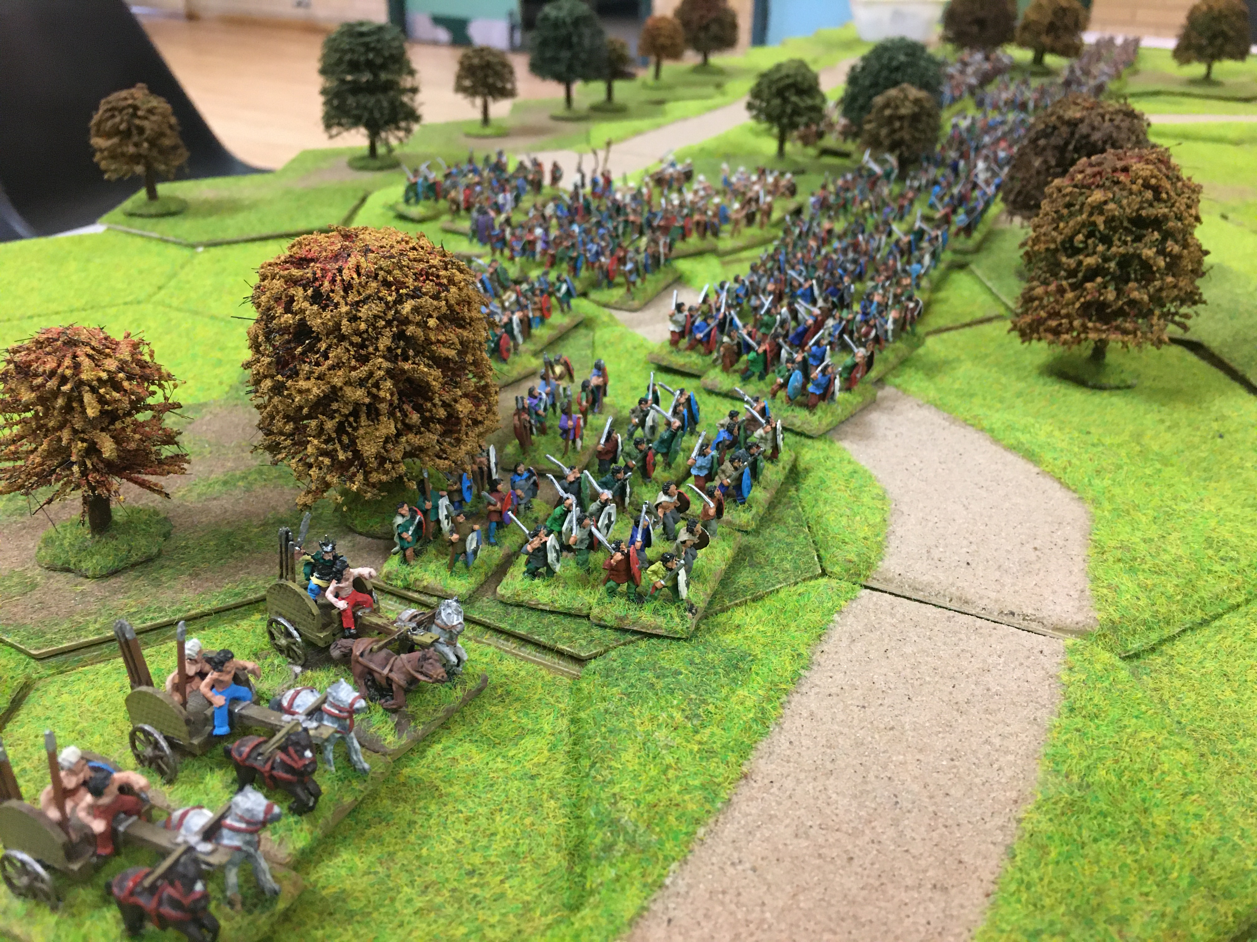 This was the second battle in which the Roman force was given the task of defending the settlement of Reading. The terrain was very open around the ‘town’ which had a road or rather a trade route running across its frontage and a junction from this led through Reading to the Roman table edge. Chris, Tony and James took command of the British attacking force and Joe and I the Roman defenders. This very open terrain in the centre would present our Roman’s with a major problem when dealing with the mobility and missile power of the Brits, and so, we worked out a battle plan which would hopefully compensate for our limitations.