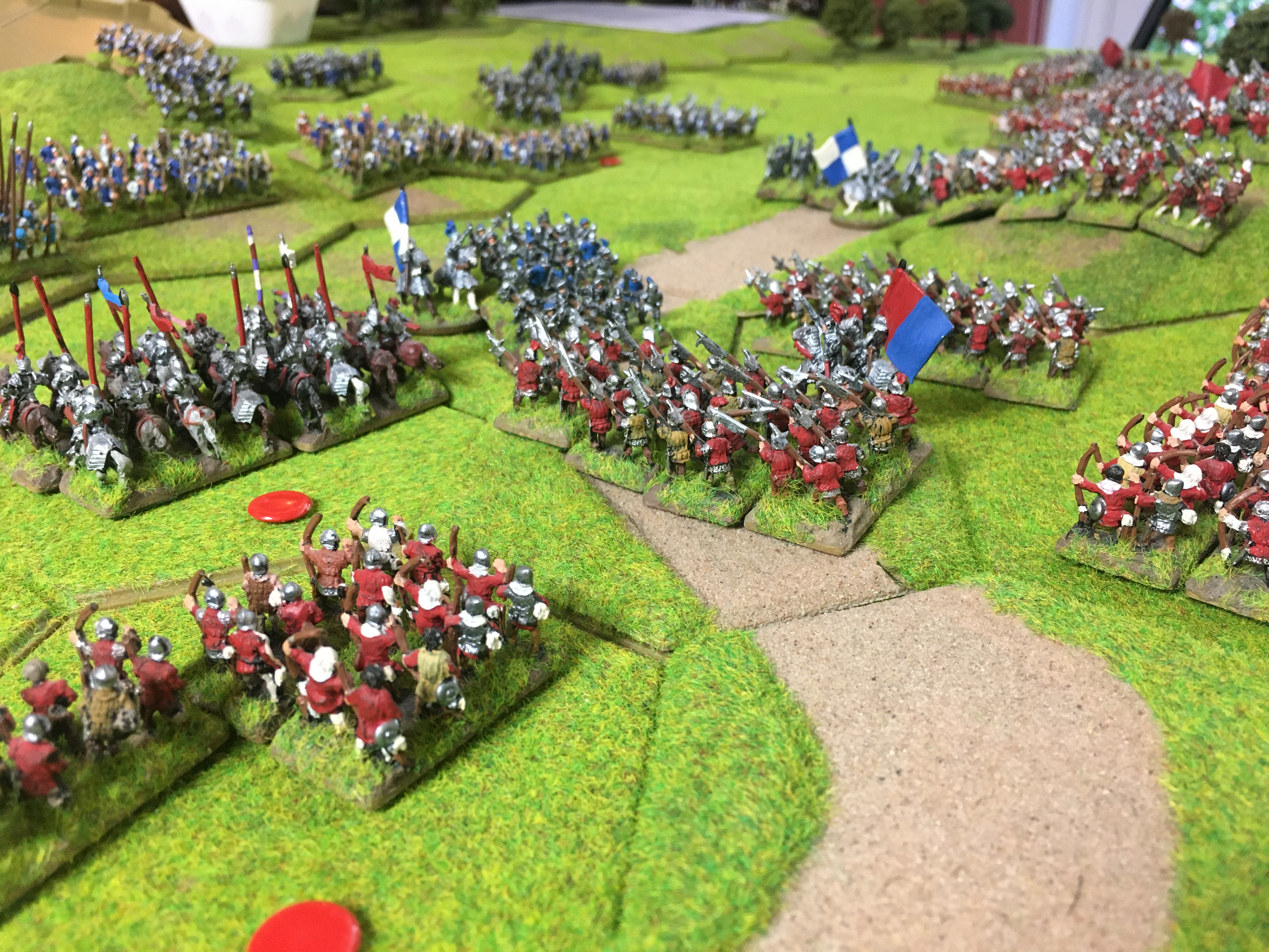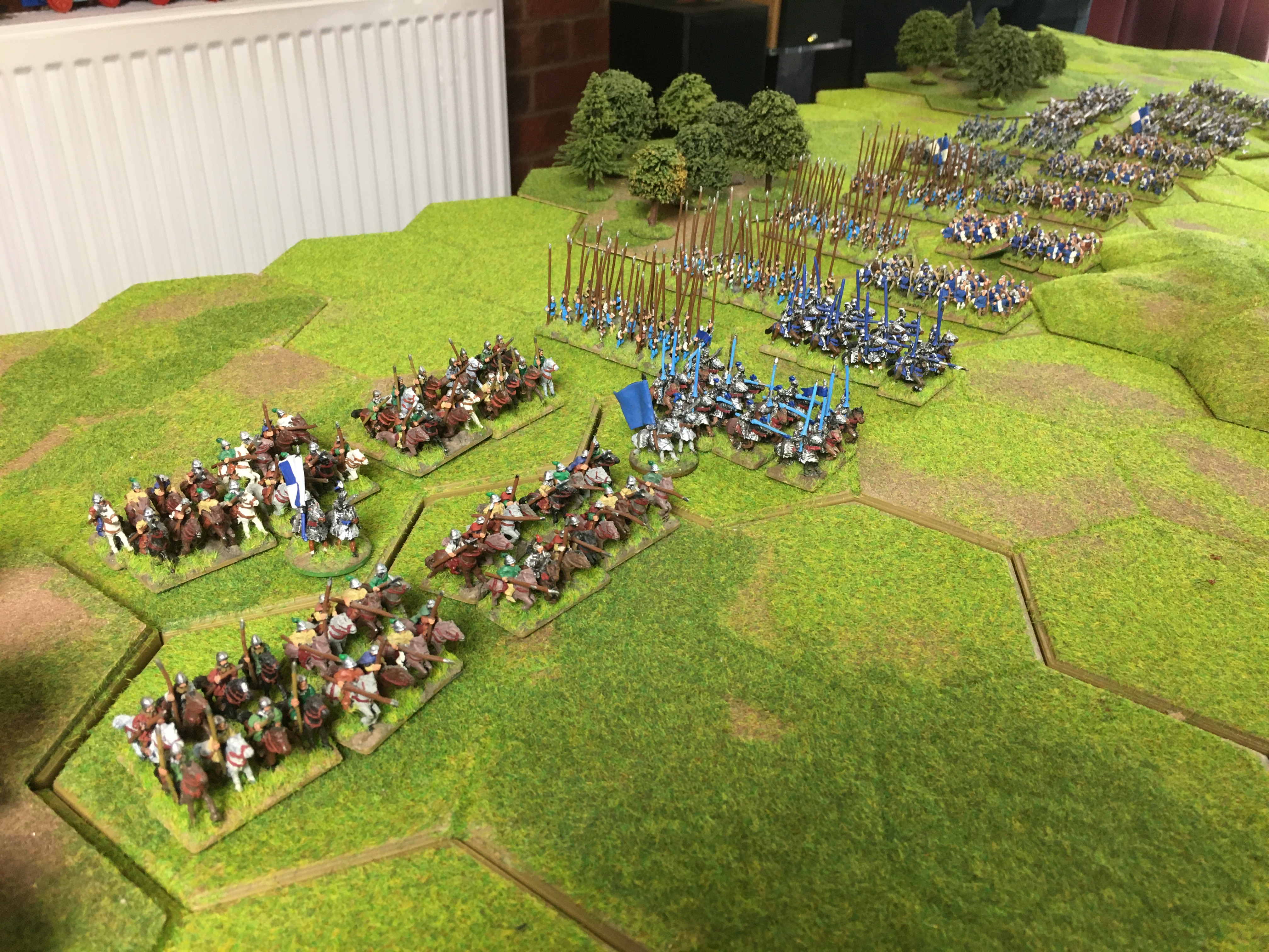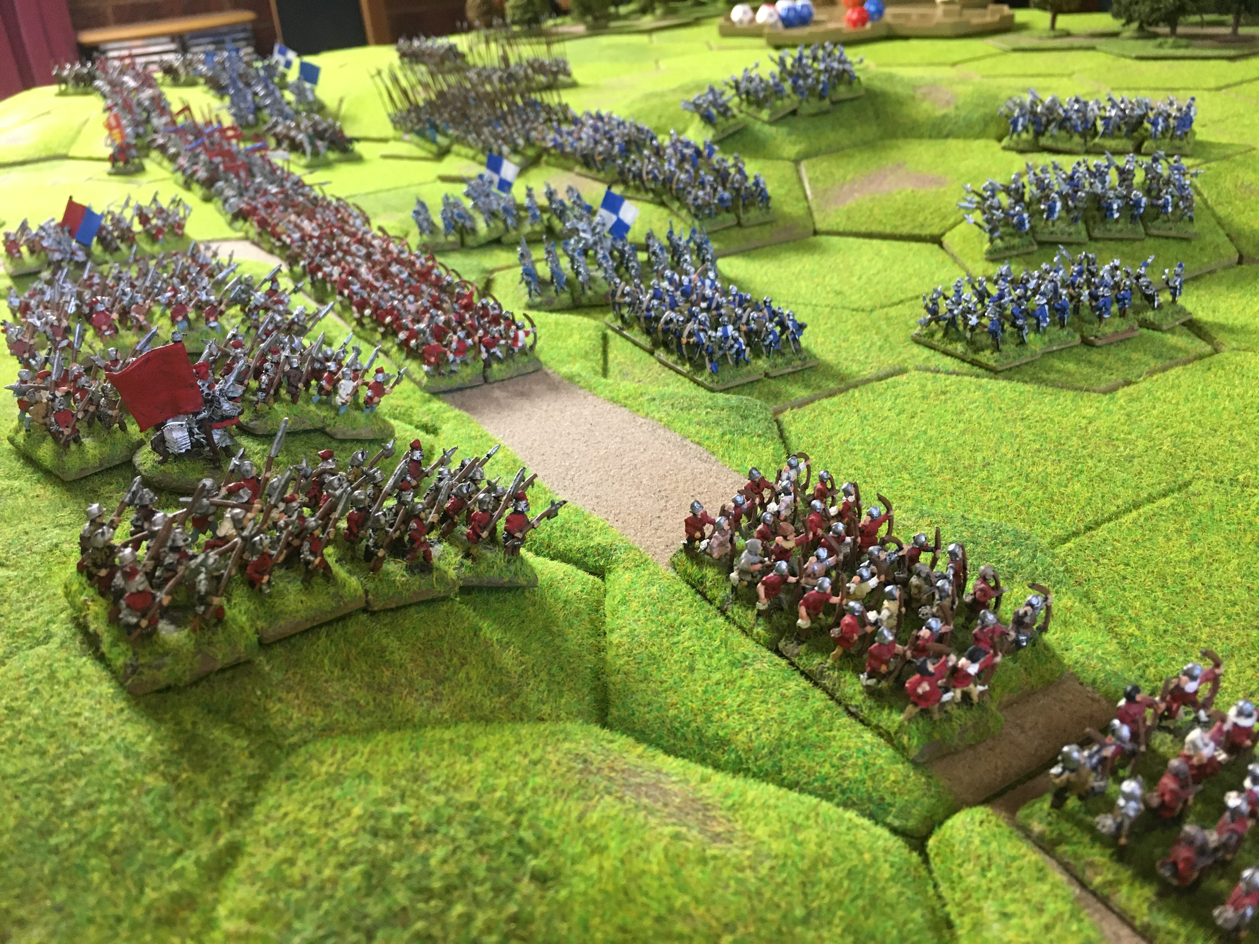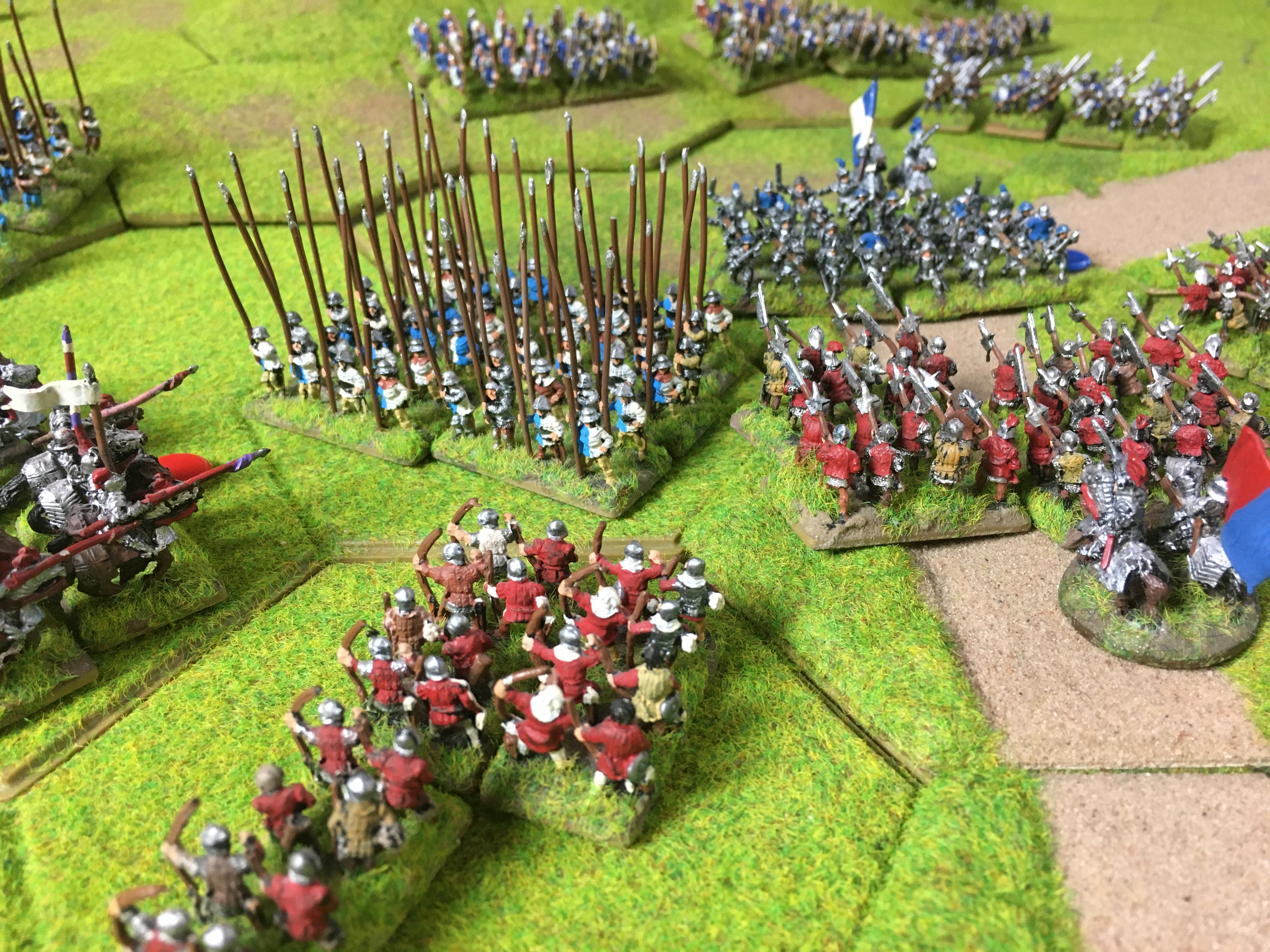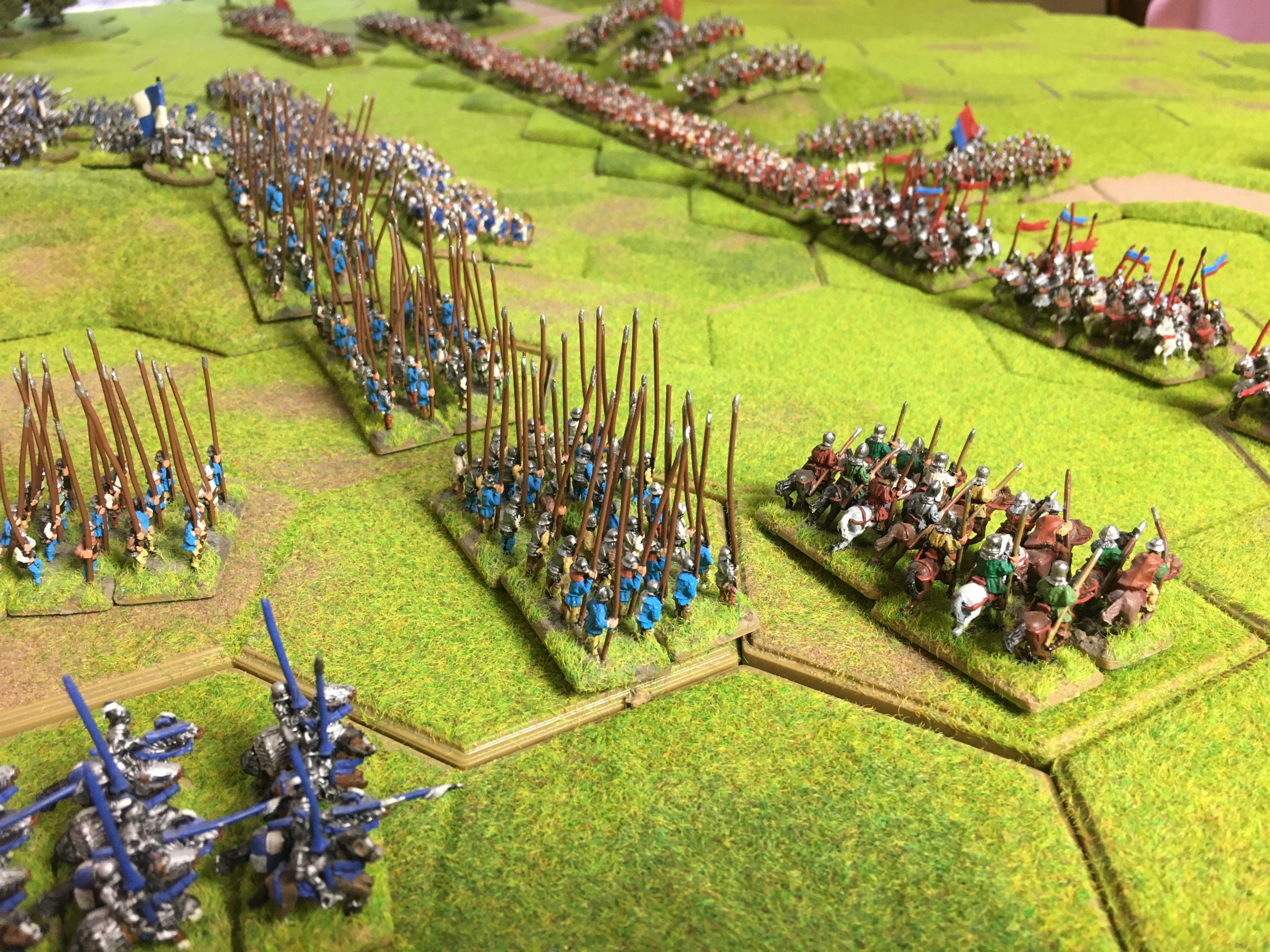 Wow! it's beautiful gamePaul K wrote: ↑Tue Jun 30, 2020 10:17 pm For this second Skype game Sally teamed up with Alex in Canada to take on my War of the Roses Yorkist army with a Tudor army. The table size of 6ft x 4ft enabled quite sizeable armies of approx. 275 points to be pitted against each other with plenty of room to manoeuvre. We positioned the camera angle above the board so that Alex could easily see the units and their hex positions on his projected 8ft by 5ft screen. This ‘lock-down’ induced system of distance gaming has a lot of potential!