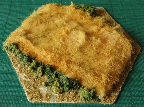 The field has been formed onto a bare hex template (from Kallistra) and the trees are bits of twig hot glued onto a washer and then basing material added.