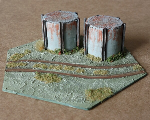 The hex tile is a blank template from Kallistra. Ignore the cycle caps, they will become silo's or machinery in another feature. There are plenty of things on shop shelves that can go into the 'bits and bobs' box, to await a wargaming use!