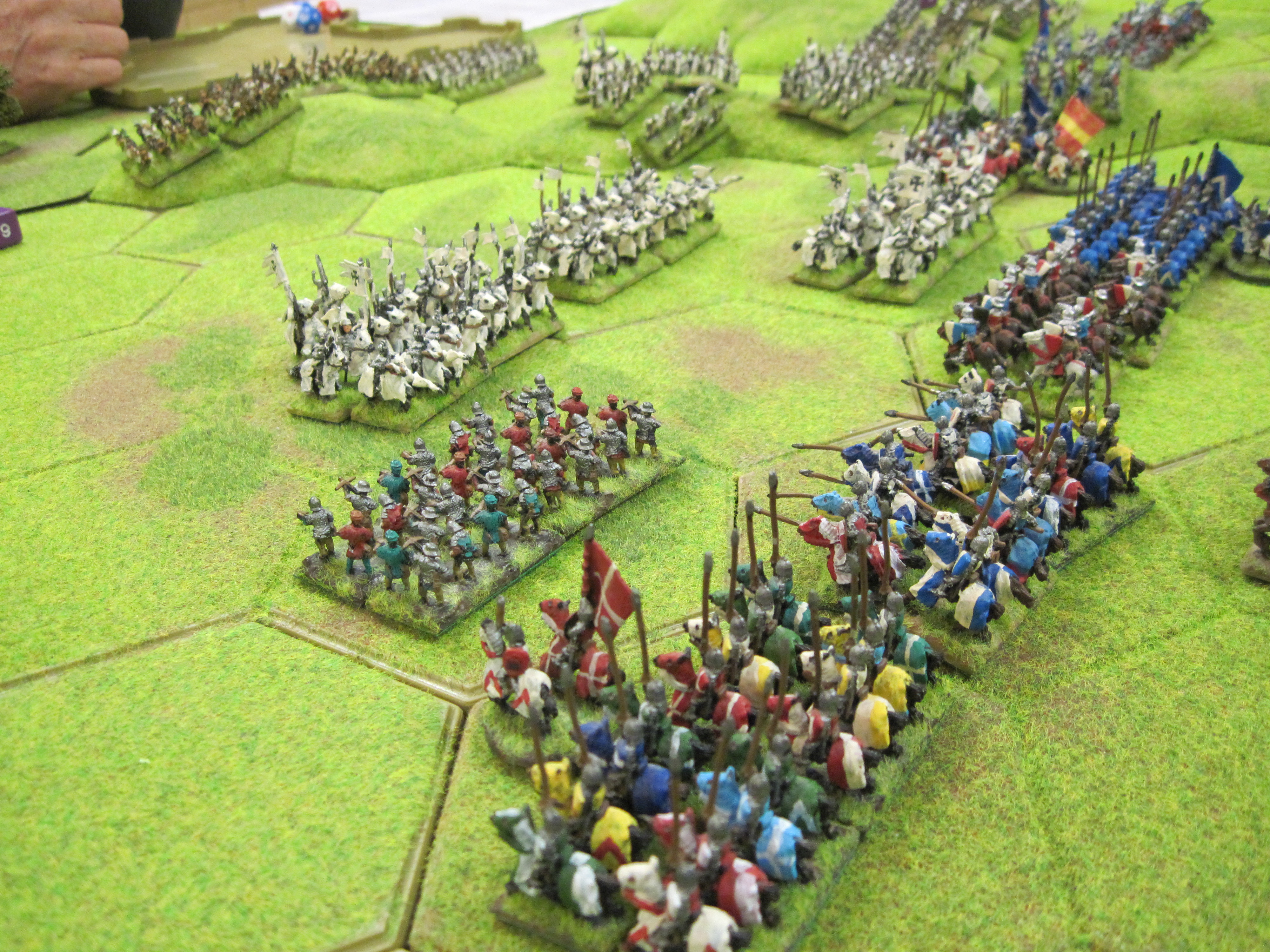 Mike and I had the French and Dave the Teutonic Order and the French won the di roll for choice of table edge which gave us the table edge with the most terrain features. The Teutonic army had control of the central open area of the table in which the mobile Teutonic mounted crossbow units would have control. However, French infantry occupying a 3 hex wood gave much needed protection to the French knights deployed in the centre. Mike deployed the French crossbows in a line behind their pavisses on the right of our line facing the Teutonic crossbows.