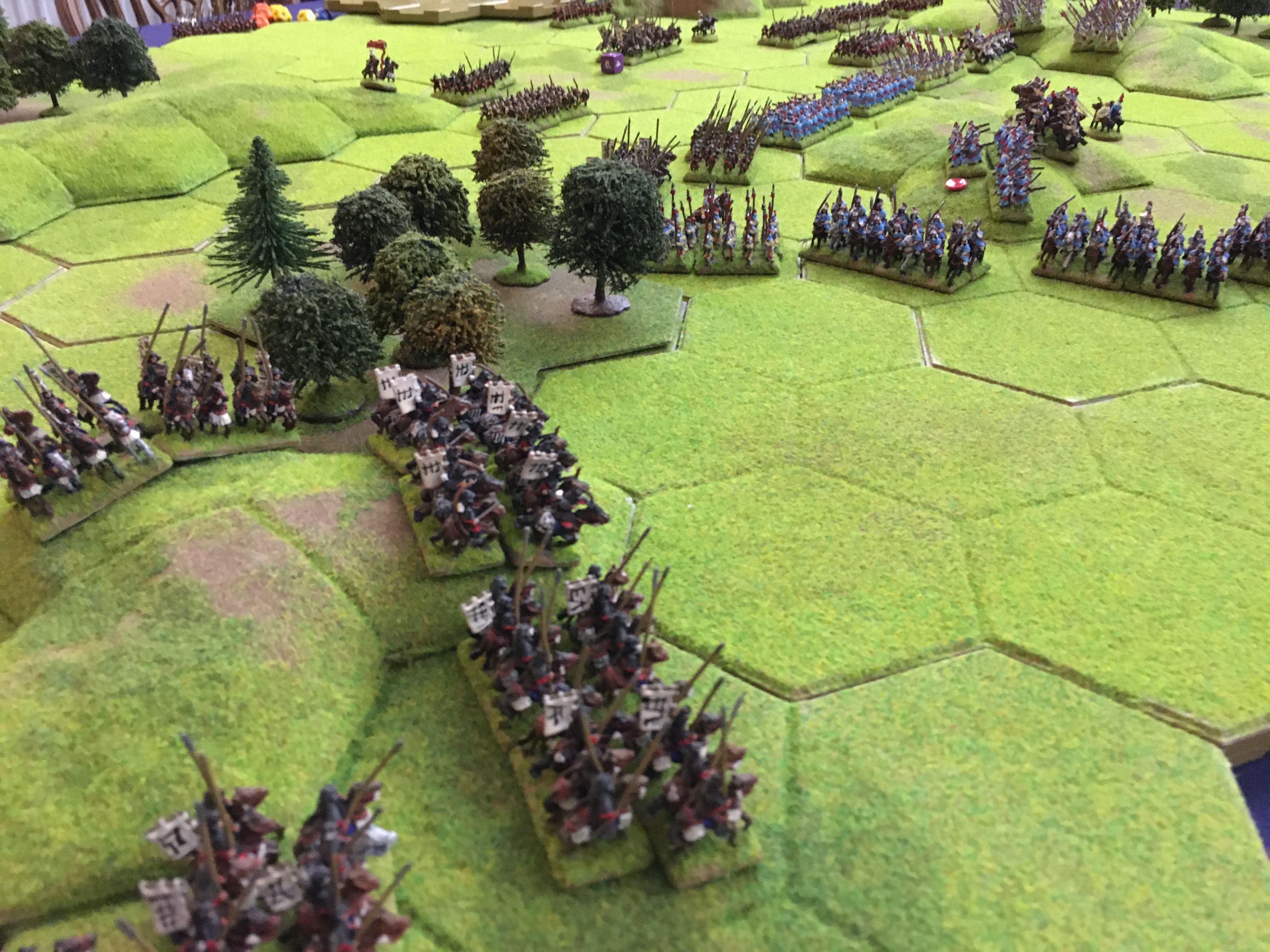 Alex also halted his line and then sent 5 units of mounted Samurai towards the ‘North end’ or my left wing to circumnavigate around the aforementioned 4 hex wood. This was a clear attempt to get behind my left and rear and in response I had to switch my 3 units of heavy cavalry and a unit of spearmen to plug the gap between the wood and my table edge.