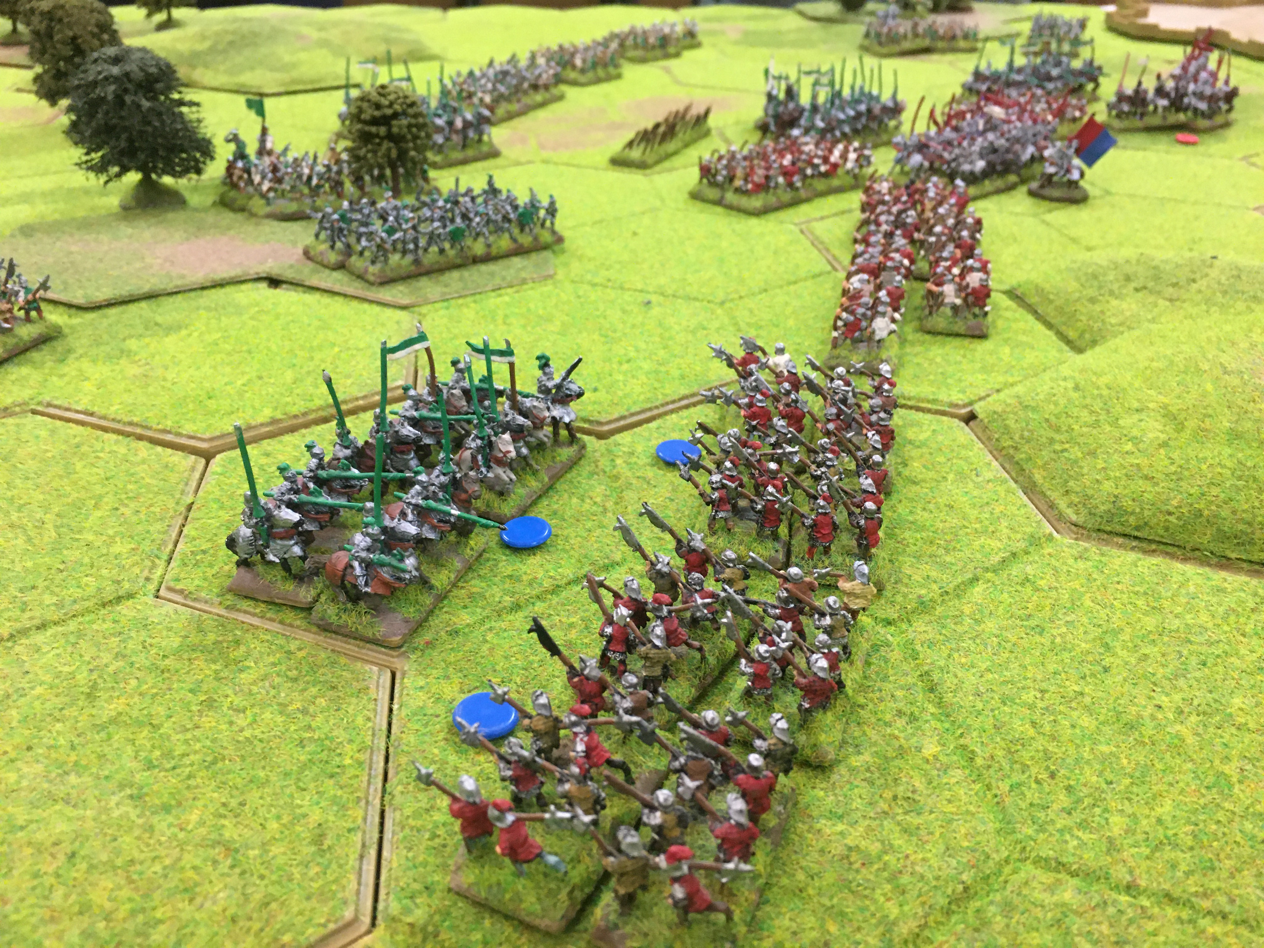 Tony positioned all but one of our mounted men-at-arms units behind our Lancastrian longbow and the threat of a charge made Chris cautious and he halted his advance and his longbow planted stakes. However, Tim through caution to the wind and charged his infantry and cavalry towards the central wood and my extreme left wing. In response to Tim’s attack I could either pull back into a strong defensive line or meet him head-on. I chose the latter!