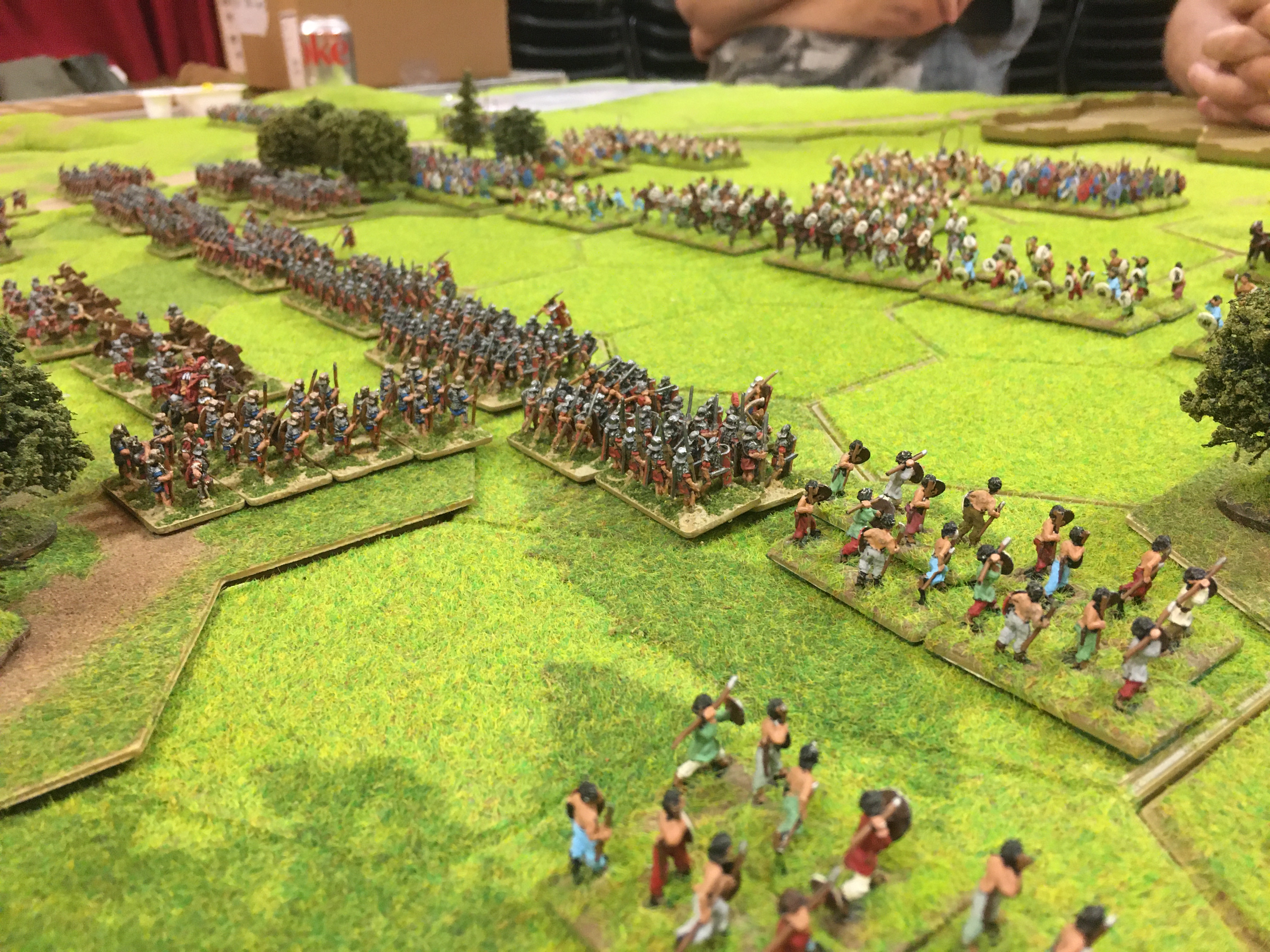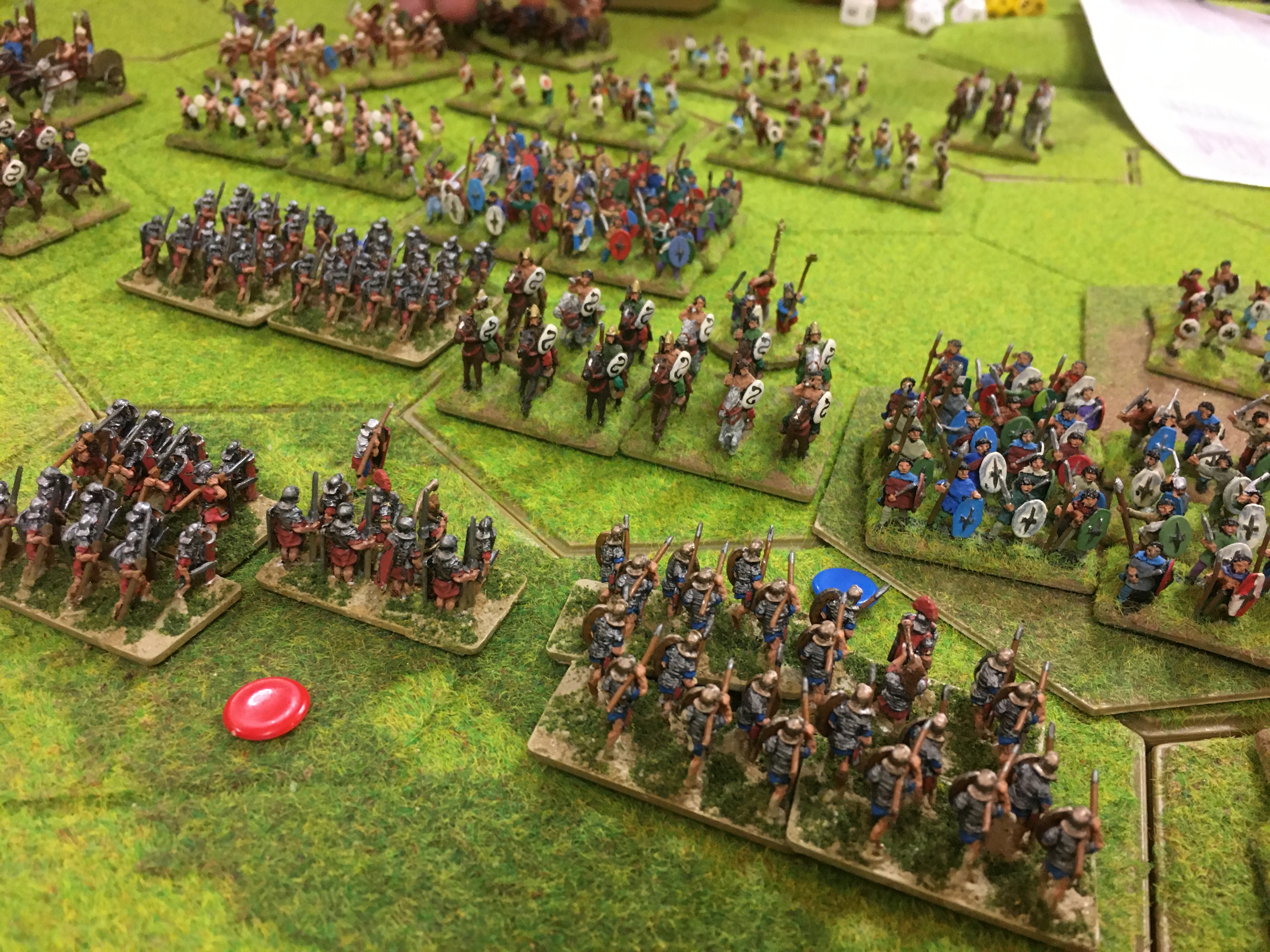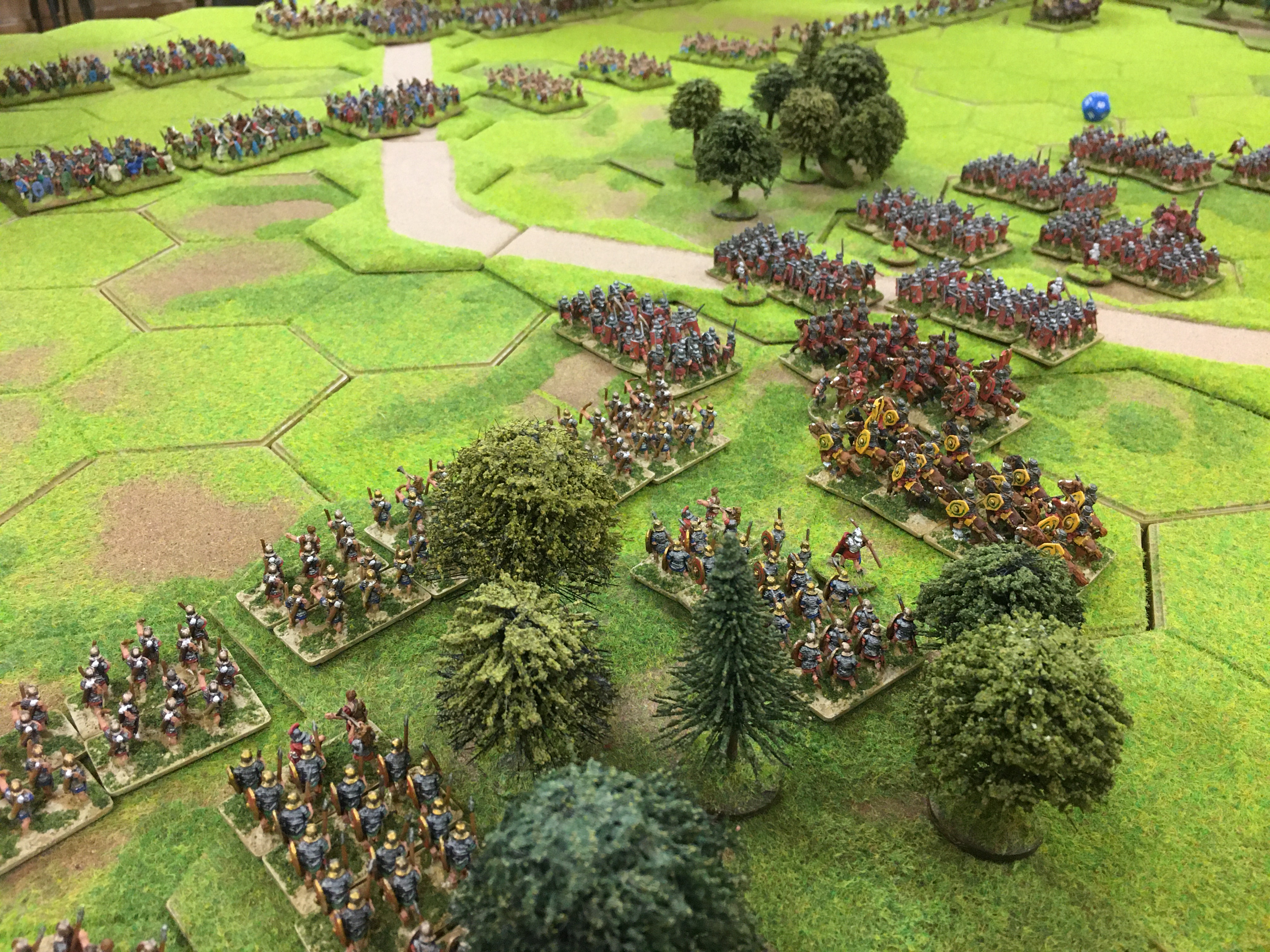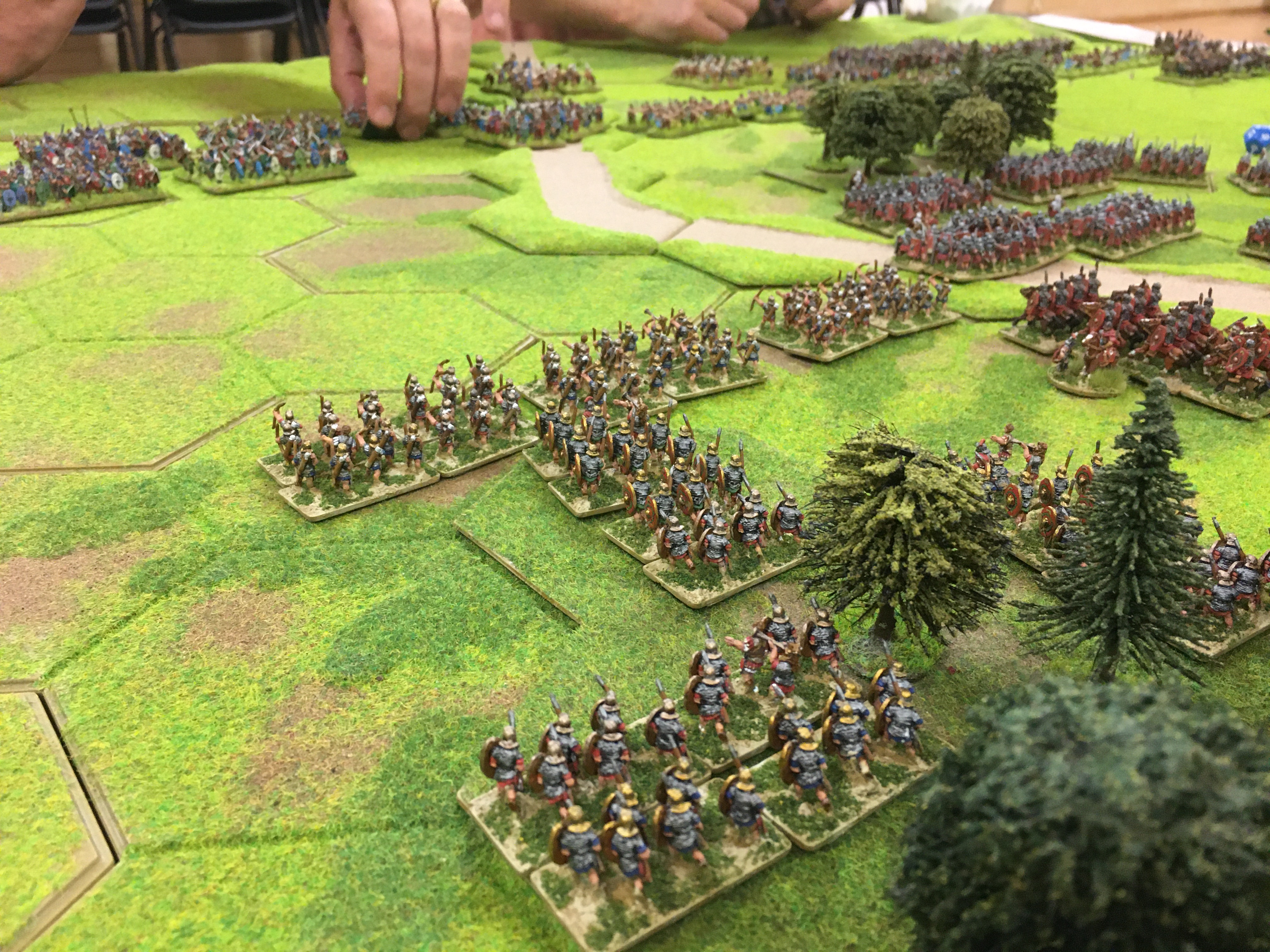 After suffering steady casualties through missile attrition my units finally could get ‘stuck-in’ to some hand-to-hand combat and inflict some significant losses on the British warriors. My shooting and throwing was erratic, especially with the pilum, but command and control issues began to affect the British as most of their 5 generals were concentrated on one half of the field. Tony, with his only general locked in combat saw his right wing of the British army slowly disintegrate. The Brits finally captured the 4 hex wood in the centre with their Gaisatai fanatics and their general. However, this had been anticipated and my reserve legionaries soon sent these to the casualty tray.