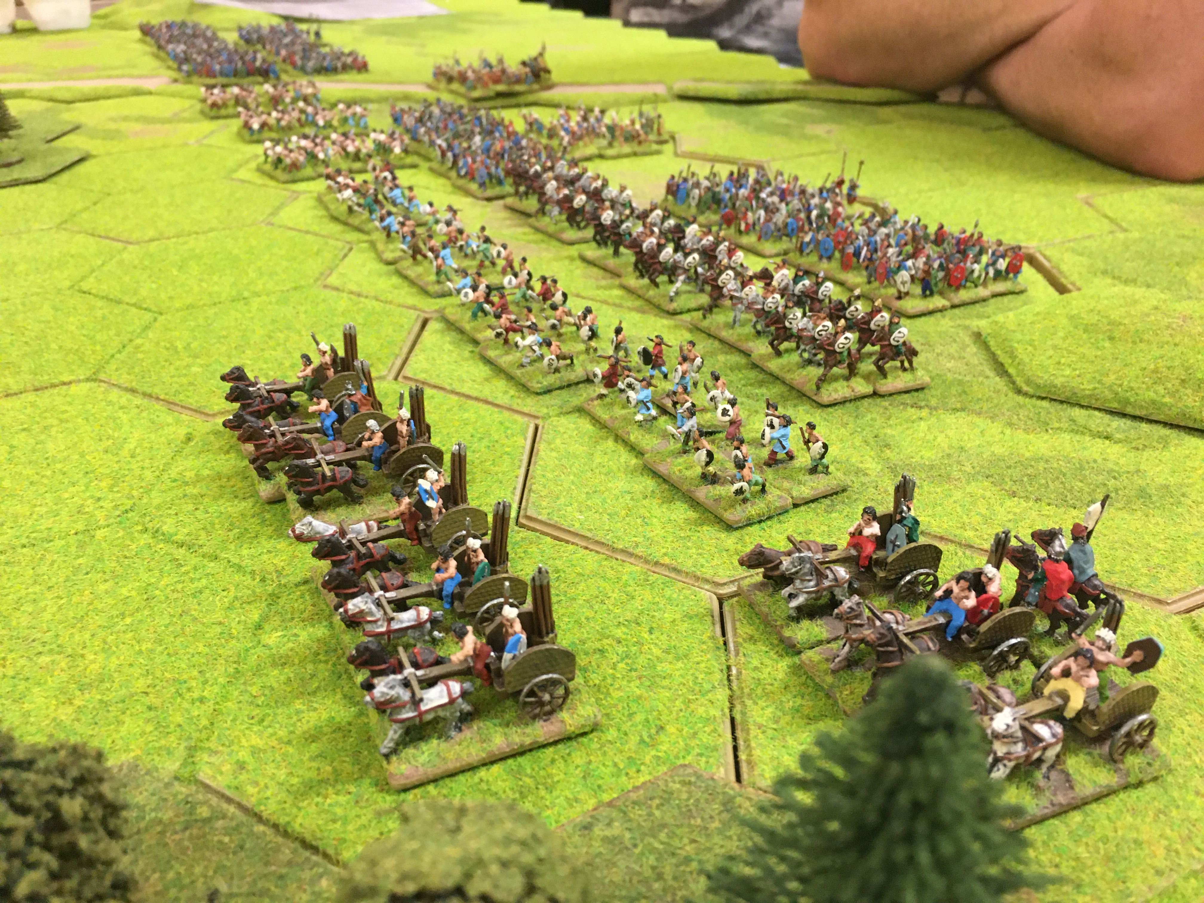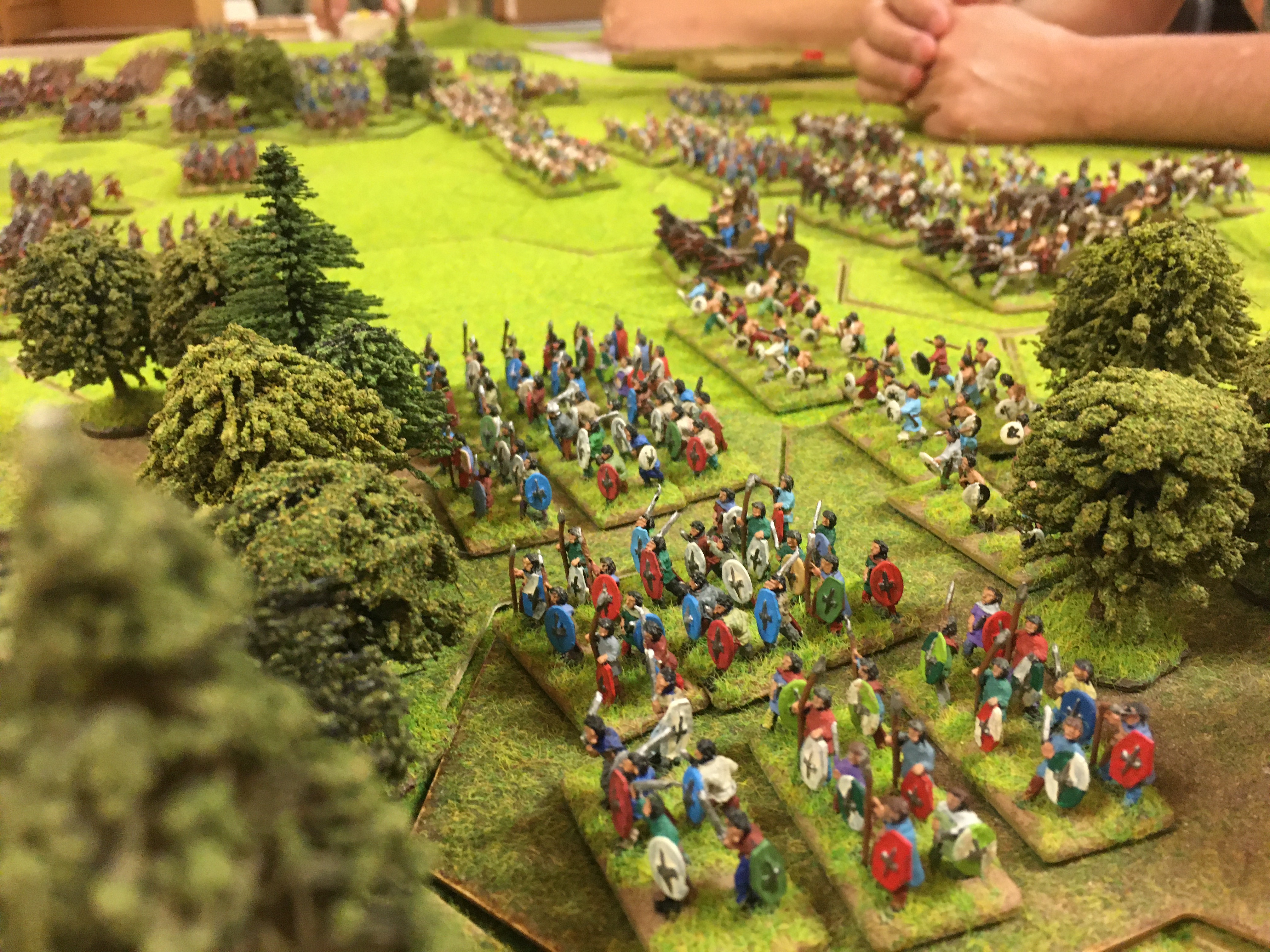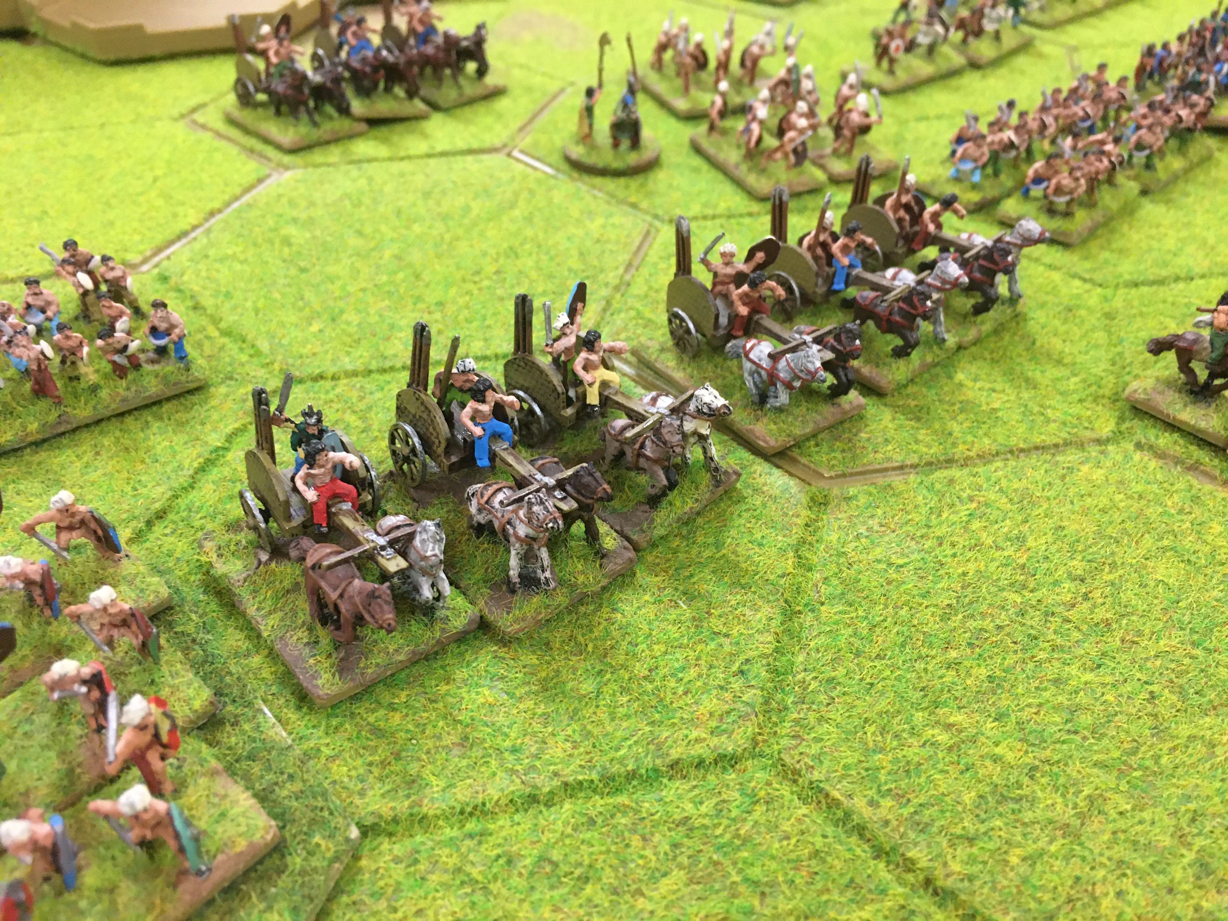 I advanced my Romans to form what I hoped would be a strong defensive line making good use of small areas of woodland for cover against missile fire and stall any sudden charge from the much faster moving British army. Soon Chris’s British shooters and throwers were embarked on their project of slowly whittling down my line of legionaries and evading any attempt to bring them into hand-to-hand combat with my pilum armed units.
