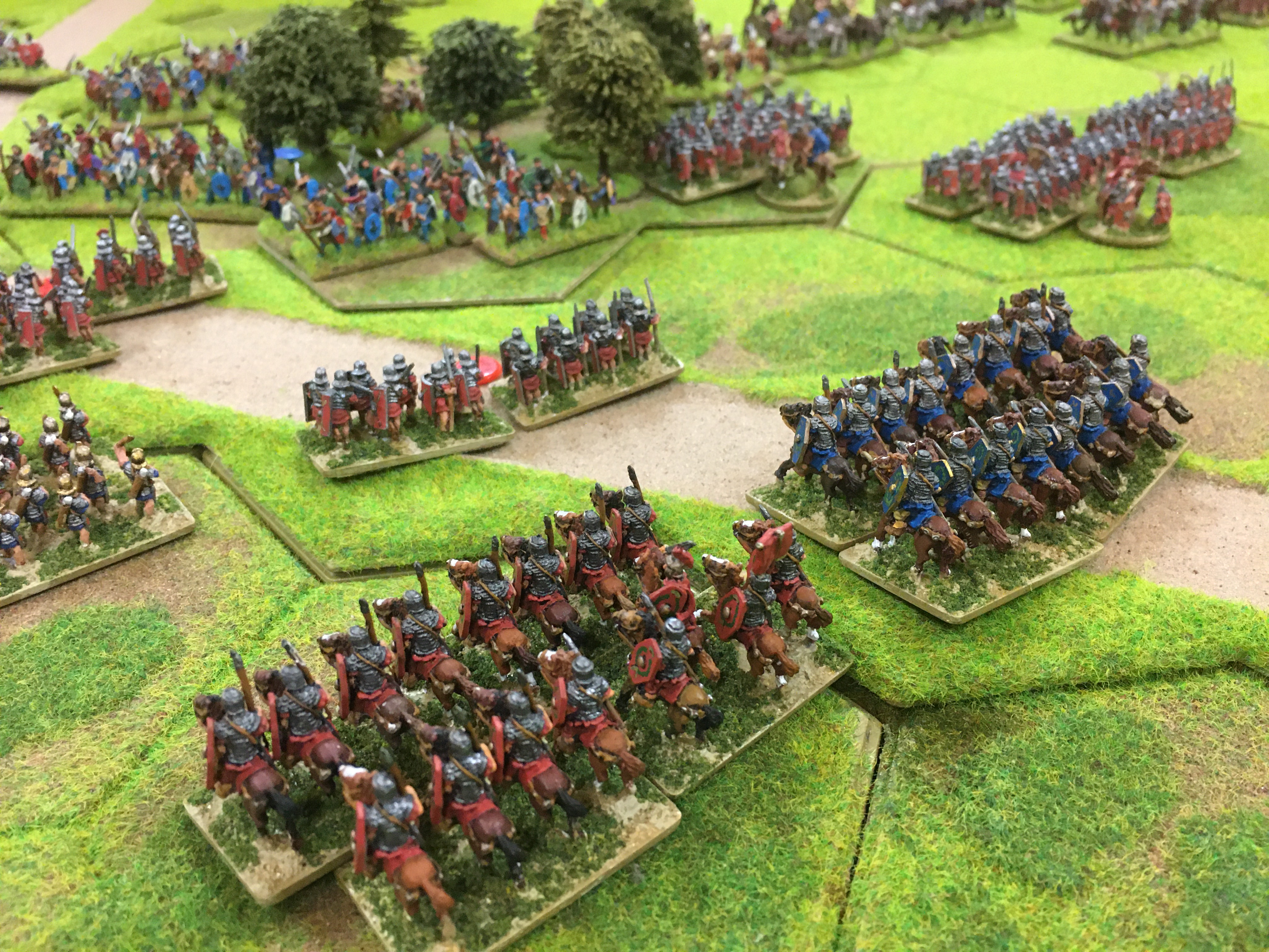 On the opposite wing the massed hordes of British warriors were lined up facing my 3 units of auxiliary bowmen and spears, only the lurking Roman cavalry behind would offer any real deterrent against a sudden mass charge. The small central woodland adjacent to the road was the point of the first British assault lead by Gaisatai fanatics and a general. This started a local battle that would last for more than an hour and suck in reserves from both sides. By sacrificing my legionaries to an ordeal of a slow missile death, I had in fact prevented the Brits from fully exploiting their much greater mobility. This enabled my Romans to go onto the attack on the other wing without the fear of being completely surrounded by British chariots and light horse etc. These were all fully engaged elsewhere!