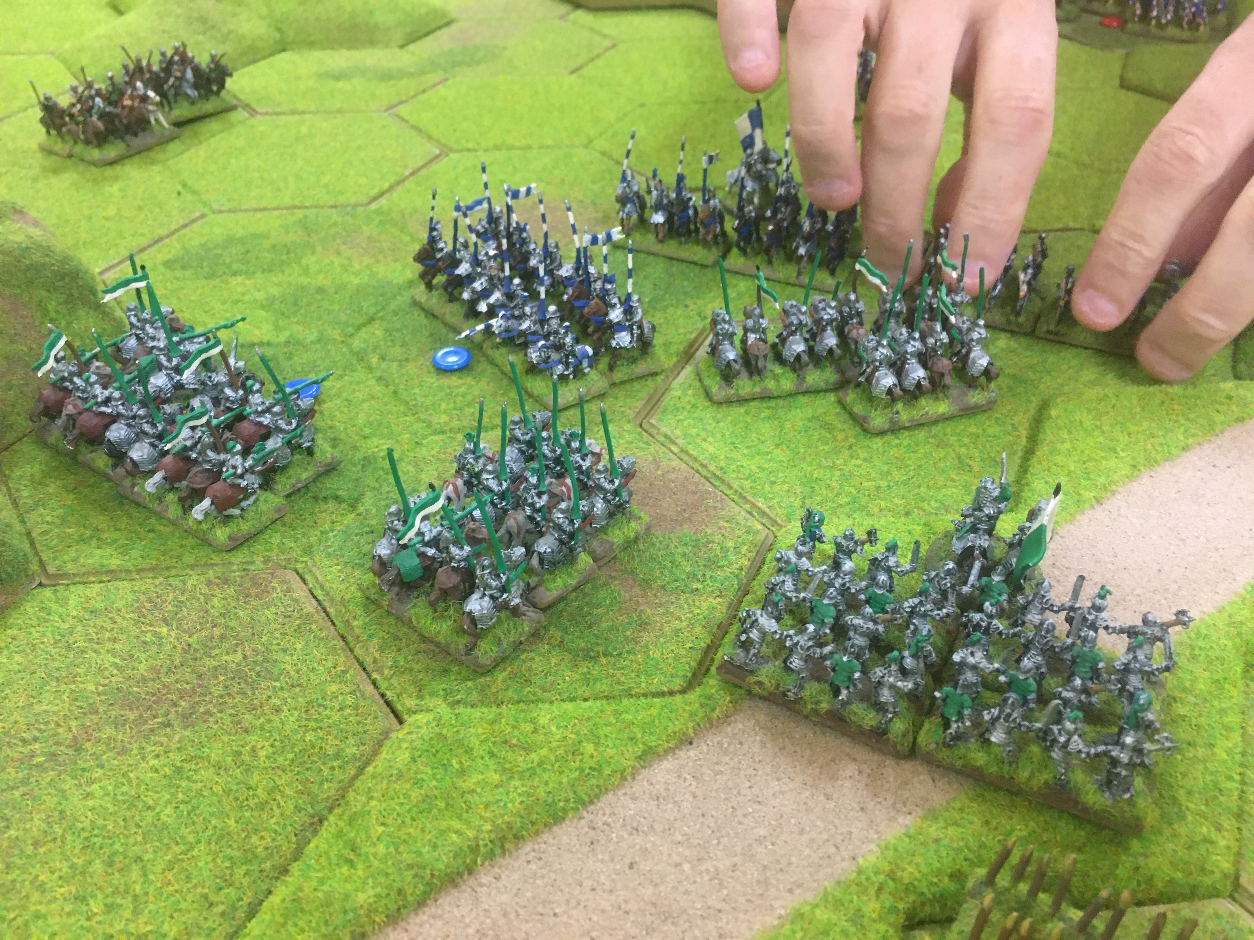 In this scenario the 2 armies met each other along a road, probably of Roman origin. They then spread out either side of the road to take up position with the infantry facing infantry on the right and the heavy cavalry facing heavy cavalry on the left. Chris’s Yorkists had an extra unit of heavy cavalry but less infantry. My Tudor army had a terrain advantage with a low 4 hex hill and a 7 hex escarpment helping to secure my battle line.