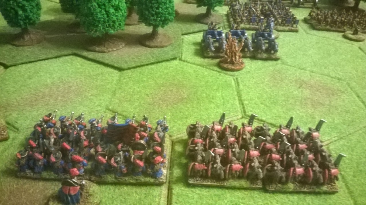 The Barbarian starting position was broken up by some woodlands but they made the best of it. They had 2 units of archers , 2 big hordes ,chariots and their catapults in the centre , birdmen on their left flank and a strong mounted right flank of mammoths , bison riders and cavalry.