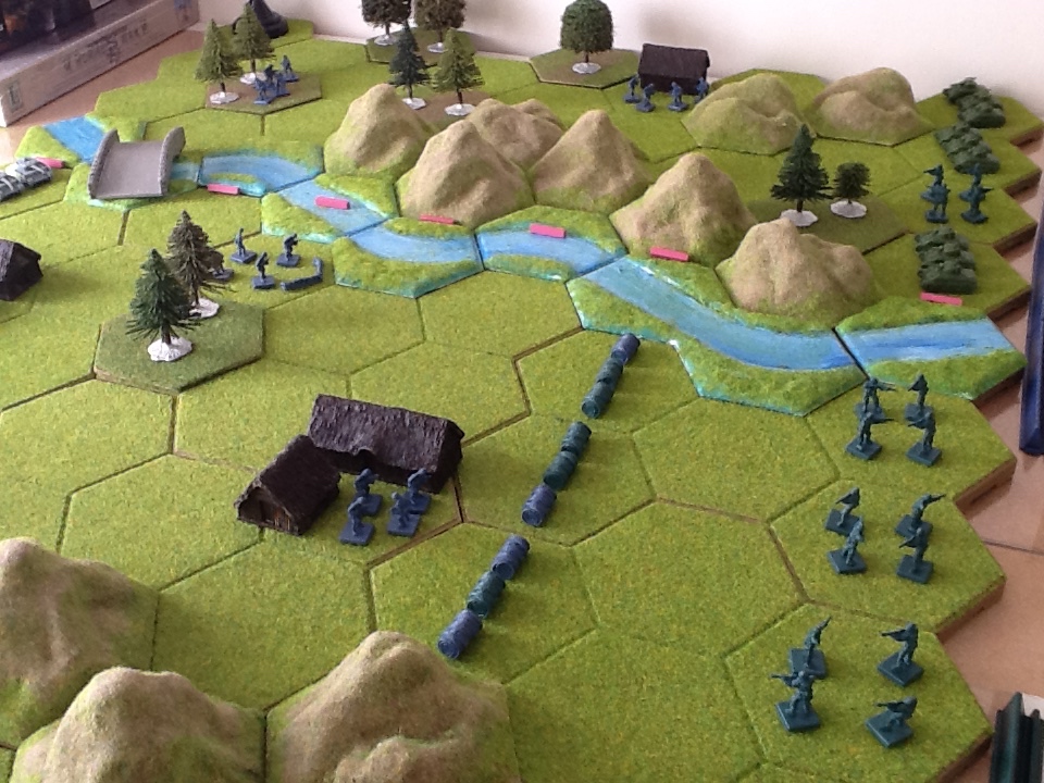 I have set up the first Memoir 44 board game scenario using Kallistra called "Pegasus Bridge" for a game. [The scenario uses Green American playing pieces to represent the airborne troops.]