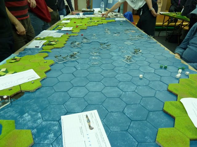 I was looking at a lot of pictures of kallistra layouts on google images and found a couple that use blue hexon for the "English Channel" and then green flocked hexes for the "Coastline". The pictures are on an EPIC scale and are truly amazing - I hope the club does not mind me showing one of them here below so you can see it.