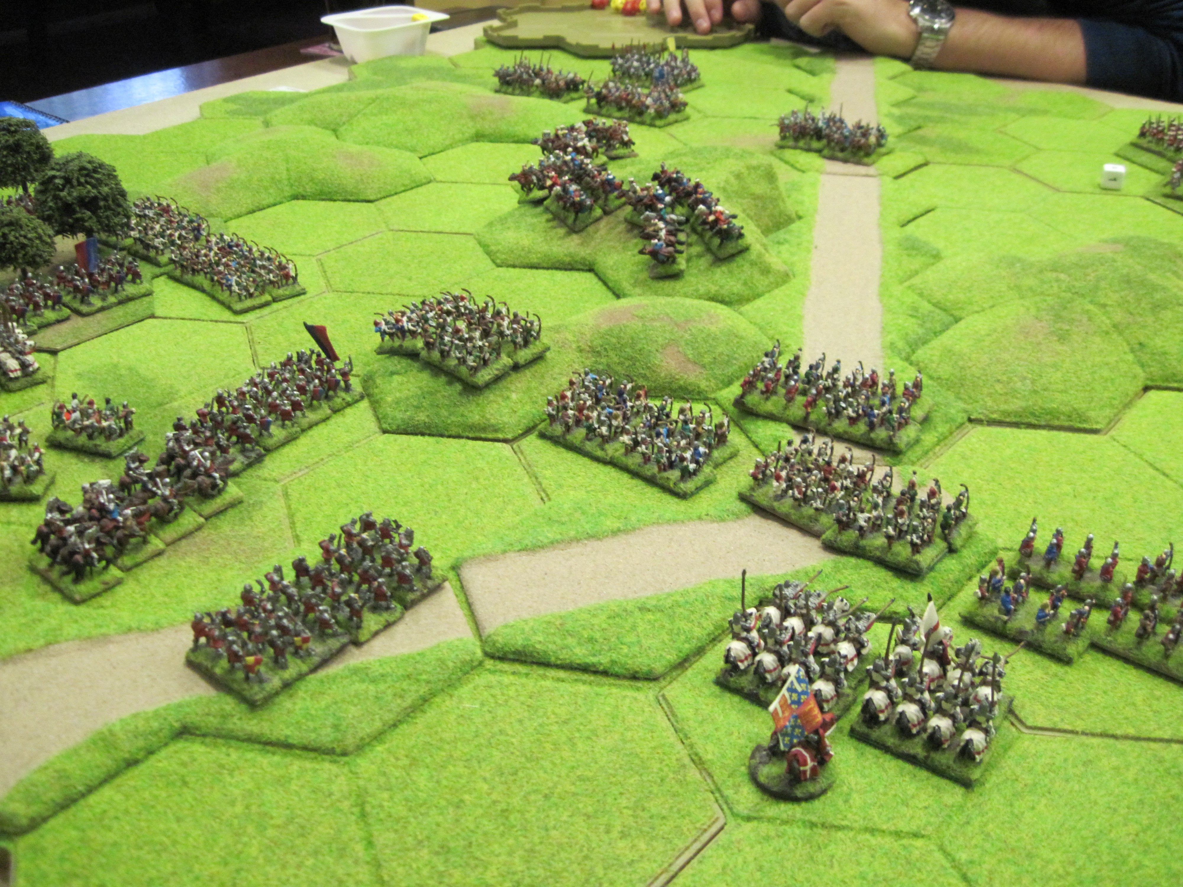 Two hexes of woodland to the left of the English centre were occupied by two units of English archers and would soon become key to the outcome of the battle. The unit of Ottoman large field guns kept punishing the English bow line, but as soon as one unit of archers recoiled another took its place. A road which stretched across the battlefield and passed by the two aforementioned woodland hexes provided the opportunity for a quick movement and attack from both sides. This was to provide the conduit for the Ottoman cavalry to quickly support their infantry attack on the English left.