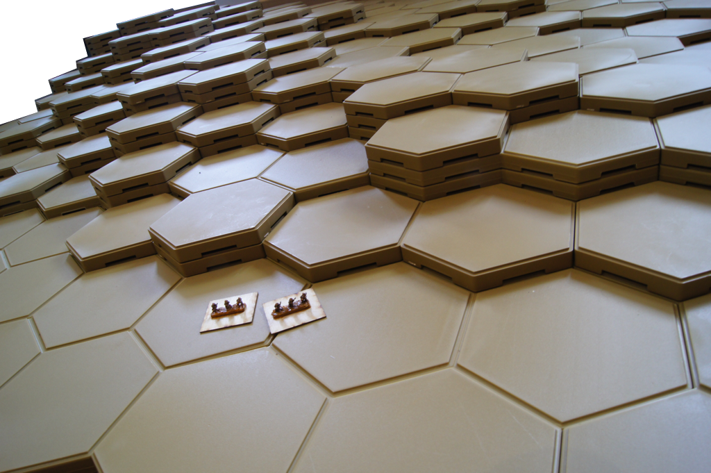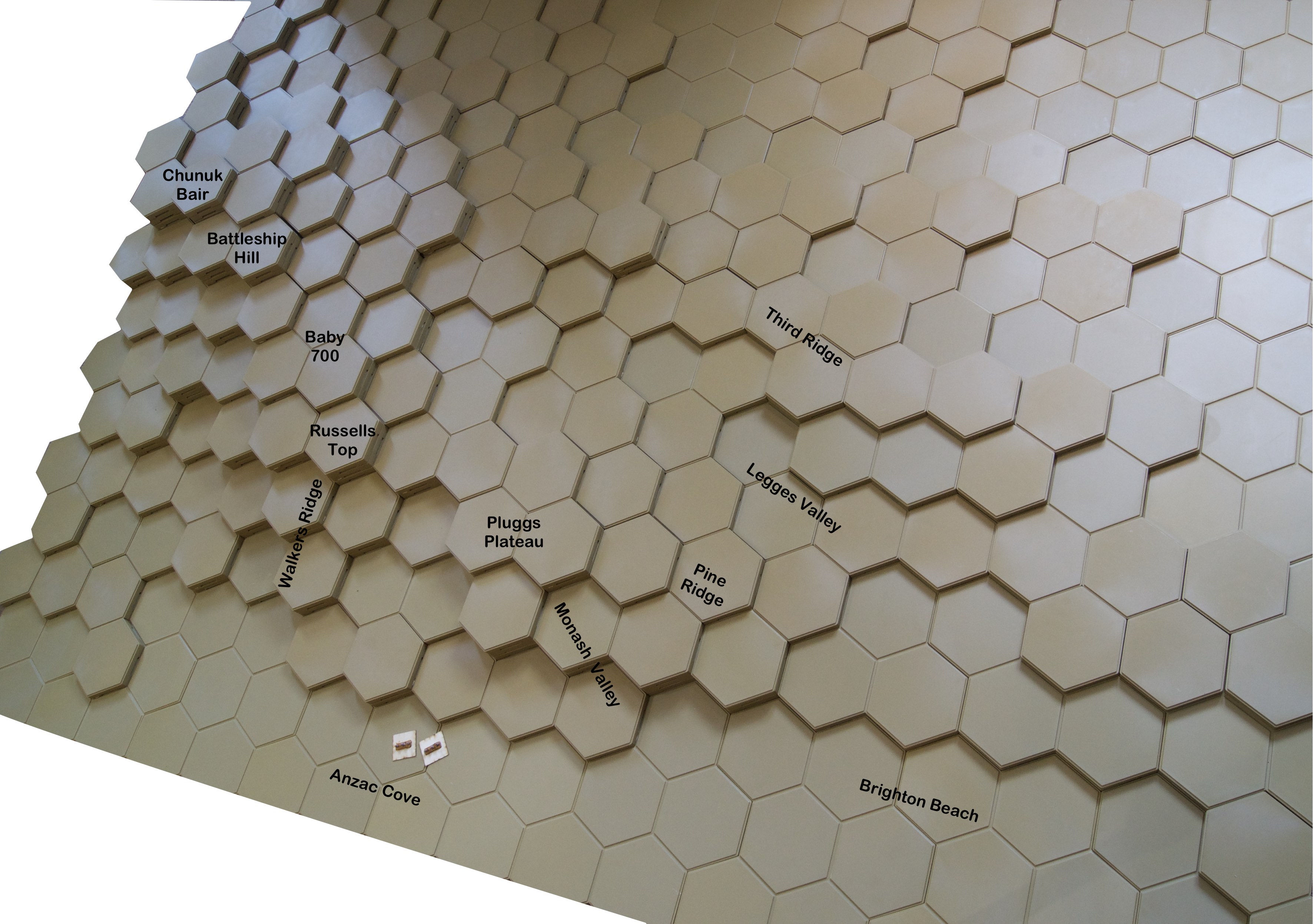 Attached are two photos of the table I am preparing for the ANZAC landings at Gallipoli (25 April 1915). Each Hexon terrain level represents a 20 metre contour. The two stands illustrate infantry companies.