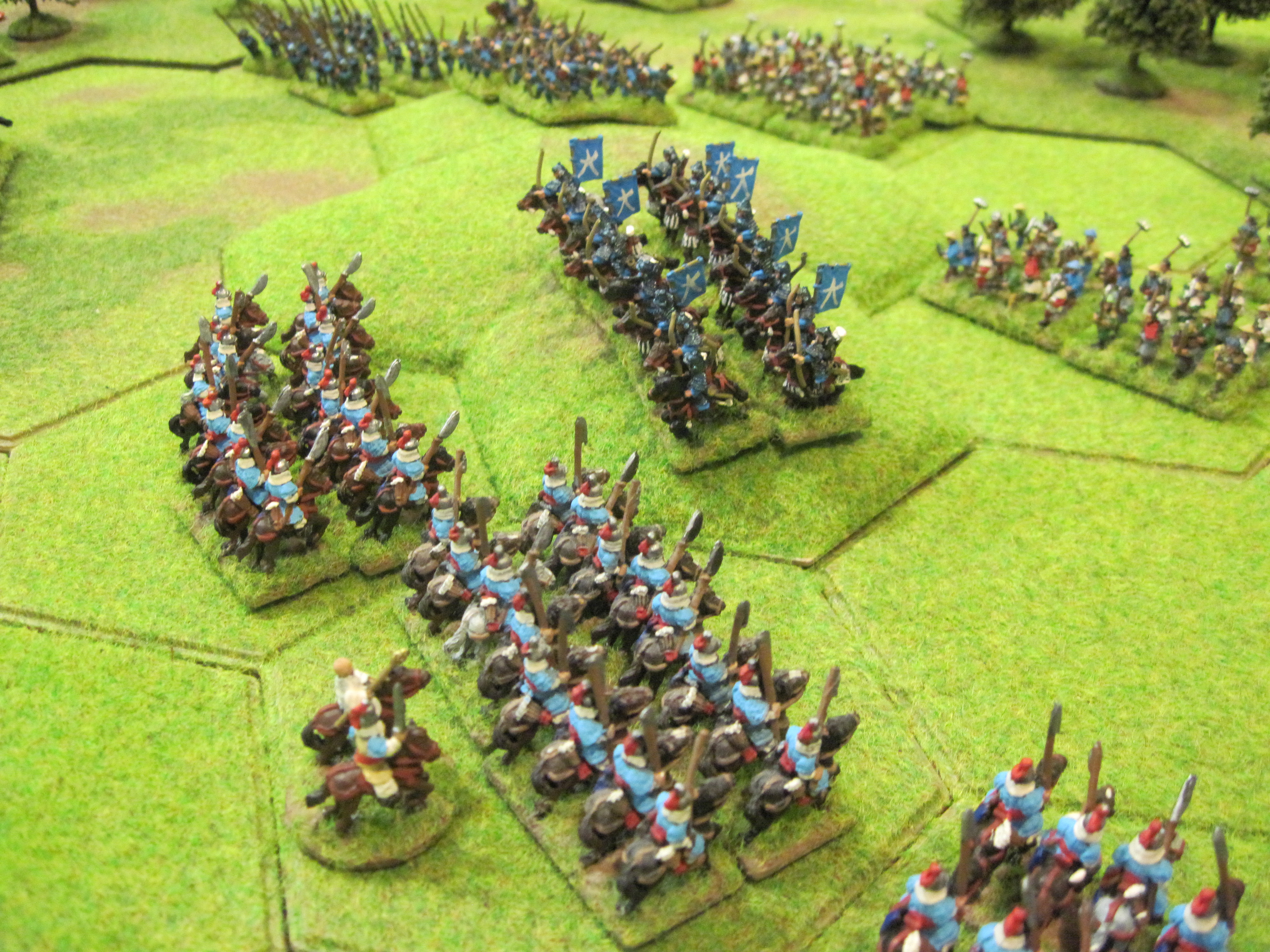 The Ikko Ikki sought the cover of the woodland as protection from the bows of the Korean light cavalry who were inflicting notable casualties on these tough B class opponents. However, support was on its way in the form of three mounted Samurai units brought across from the centre, and with Steve’s Korean heavy cavalry on its way to this part of the battlefield, the scene was set for a high impact showdown between the cream of both armies.