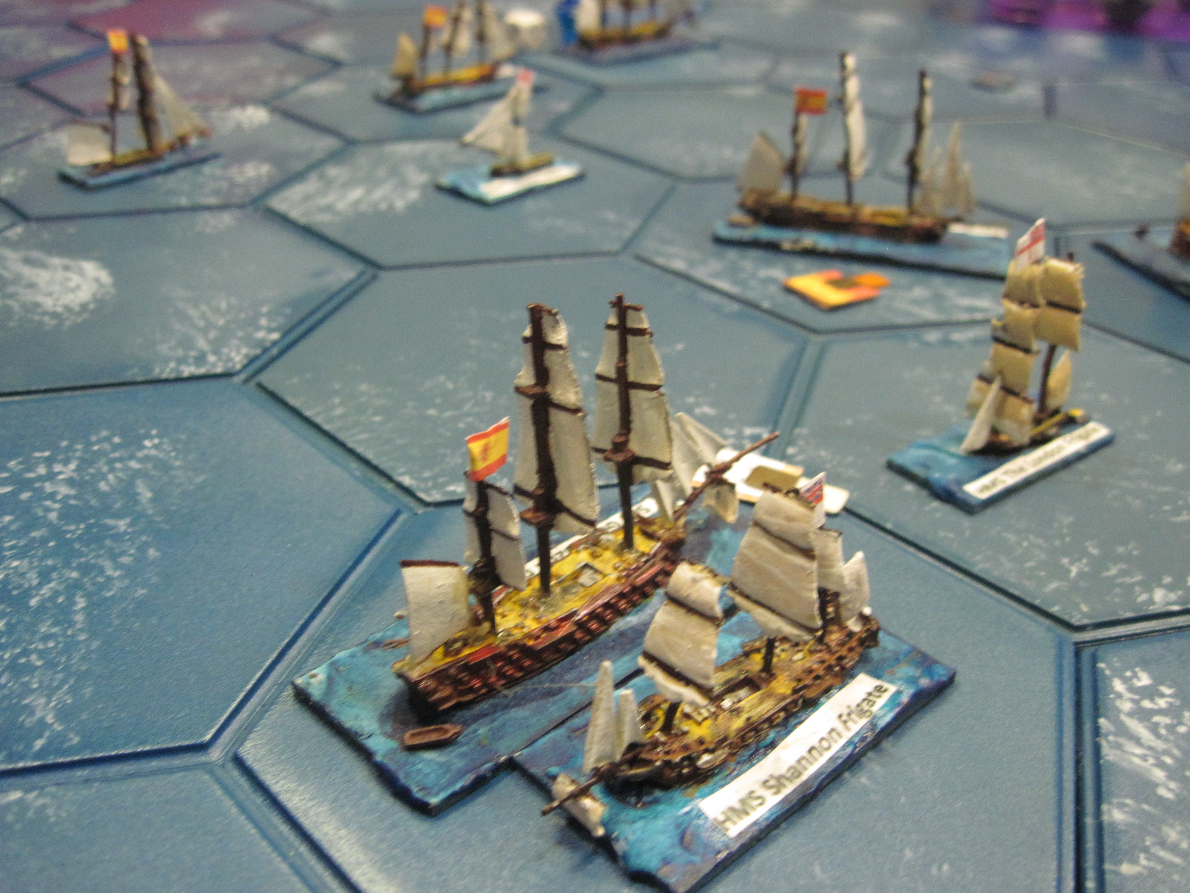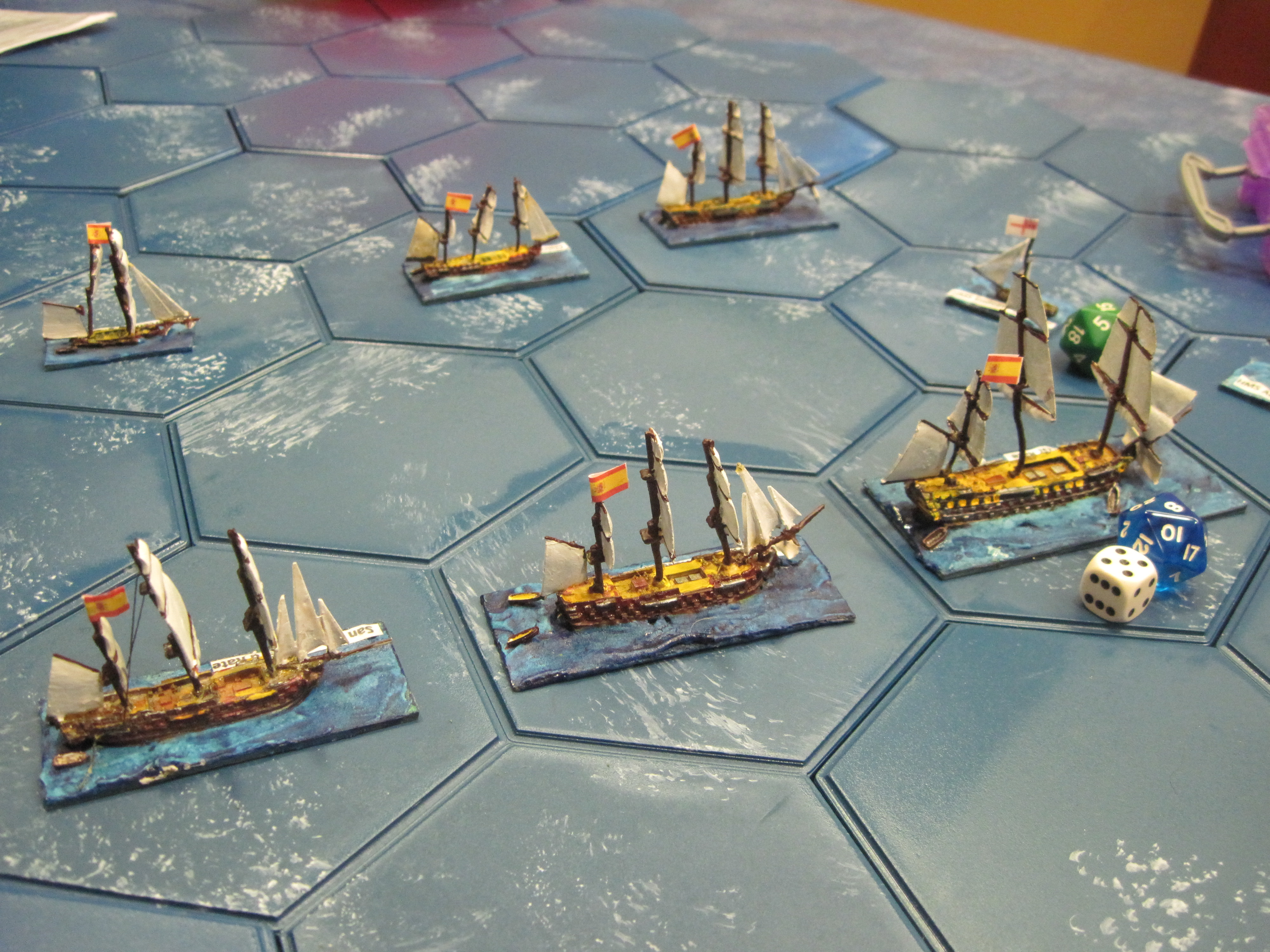 The following couple of game turns saw the British ships give as much as they got, but the initial Spanish advantage was maintained and a British frigate and then a 3rd rate ship of the line was sent to the bottom. This was not without cost as critical hits from the British gunnery had managed to set five of the Spanish ships on fire. Try as we might, we failed to put out the fires and had to watch them slowly burn like candles.