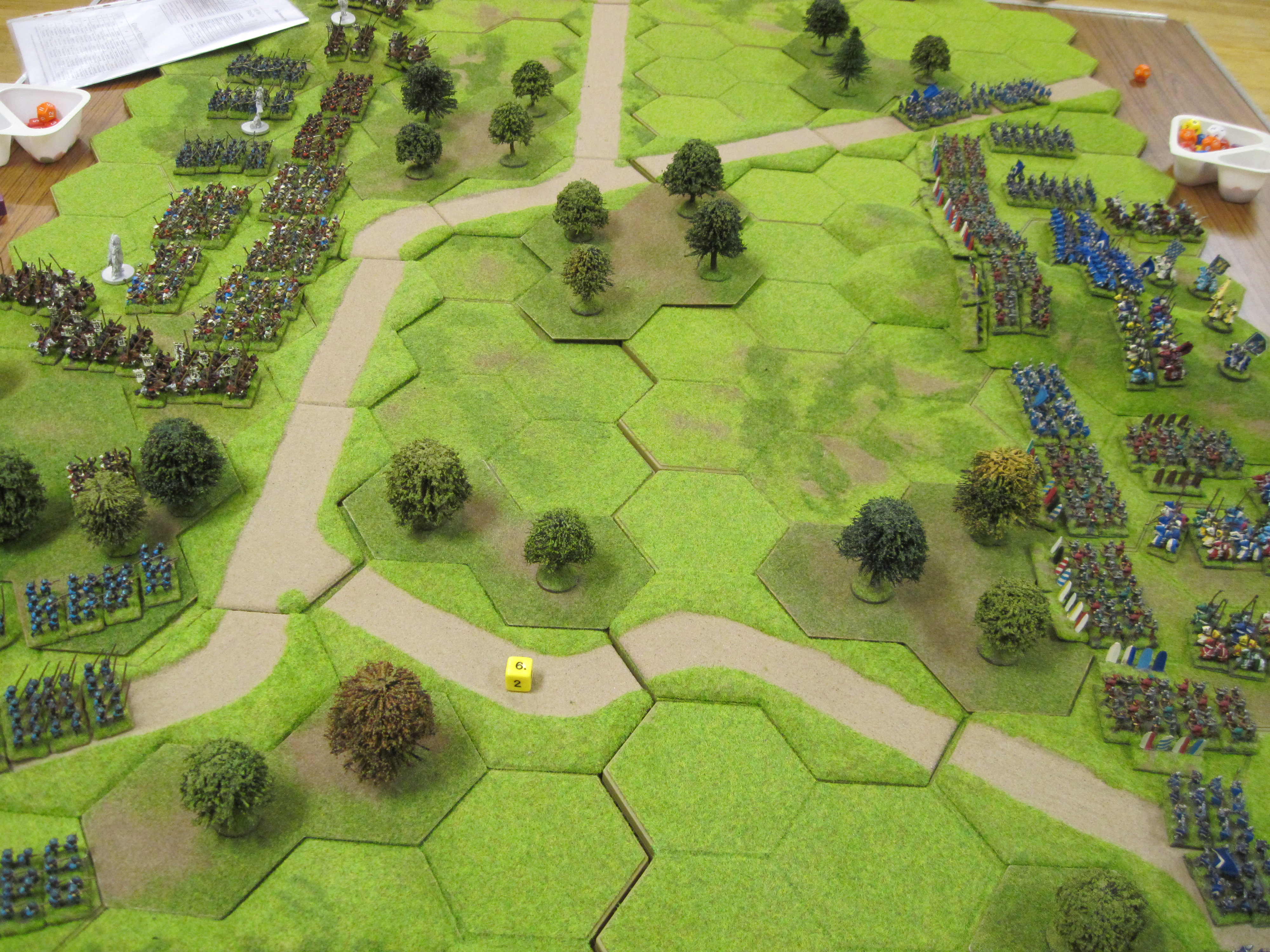 The Samurai army had 27 combat units, 2 more than the French. However, this included 7 units of peasants to balance the points cost of the 9 units of Samurai warriors, 6 mounted and 3 foot. The remainder were Ashigaru units armed with either handguns or yari. The army had 5 generals, the same number as the French. The 5 round-based Samurai generals didn’t make it to this club game! I left them on my games table at home, and so Tony kindly let us borrow 5 grey resin 28mm fantasy figures to use instead! These are the ghostly figures that appear in photos. The missing Samurai generals were therefore represented in spirit to compensate for lack of physical presence! The terrain layout for this game was a scattering of small wooded areas with a road weaving between them and a rather useful 8 hex hill located towards the Samurai base edge. By dice roll, Tony and I had the French and Chris and Steve the Samurai. The French army deployed second and moved first and pushed the crossbows forward in a line behind their pavisses. Five of the Samurai units (2 foot, 3 mounted), were positioned facing the extreme right of the French line. To counter this threat, I had to keep a good number of men-at-arms on the right to prevent any outflanking move by Steve. On the other wing, Tony was facing the majority of the ashigaru armed with yari spear or handguns. The yari was a very effective anti-cavalry weapon and the gunpowder weapons of handgunners negated all the armour of the French men-at-arms. Tony, quickly engaged Chris’s ashiguru, while I advanced to take the central woodland while maintaining an extended line on the extreme left to confront the Samurai units. Two units of ashiguru handgunners in the wood kept punishing my crossbows, disrupting them and causing units to flee, as well as recoiling all attempts by my men-at-arms to dislodge them. Events enfolded much more quickly on the other side of the table as Tony and Chris inflicted punishing casualties on each other in a territorial battle. In the centre a Samurai general, lead hordes of Japanese peasants on a successful campaign to capture the central 4 hex woodland. To counter this I had to move a general and units men-at-arms to the centre from my right wing. This created an opportunity for Steve to attack and outflank my right with his foot and mounted Samurai. Thankfully, they stayed put! The punishing hand-to-hand combats had thinned the lines of both sides in the centre and left, and Chris asked for the assistance of Steve’s Samurai. His ashigaru units had defended the 8 hex hill incredibly well but the steady rate of attrition had undermined his once strong tactical position. As the mounted Samurai units moved behind their lines towards their centre and right, the opportunity arose for me to launch a unit of mounted men-at-arms, a general and unit of mounted sergeants against the now weakened Samurai left wing. At the same time my infantry finally managed to dislodge the handgunners from the wood. The extraction of the mounted Samurai from my wing played well for me, but their presence was certainly felt in the centre as they re-enforced the ashigaru. The Japanese peasant hordes, which had created so many problems for the French in the centre were now all but eliminated. One of my units of mounted men-at-arms made a compulsory pursuit move which brought it into contact with 2 mounted Samurai units. This tied them into hand-to-hand contact, but more significantly, caused the Samurai army major command and control problems by virtue of its ‘zone of control.’ Steve and Chris, because all their remaining 3 commanders were tied into hand-to-hand combat, and because of the current position of units of both sides, were not able to command any of their units to move in their tactical movement phase. But, more importantly, this situation wasn’t likely to change in future phases as Tony and I could now use our ‘free’ units who were in command and control, to isolate the aforementioned Samurai commanders. And, in doing so, bring about an extremely hard-fought French victory. Game Analysis