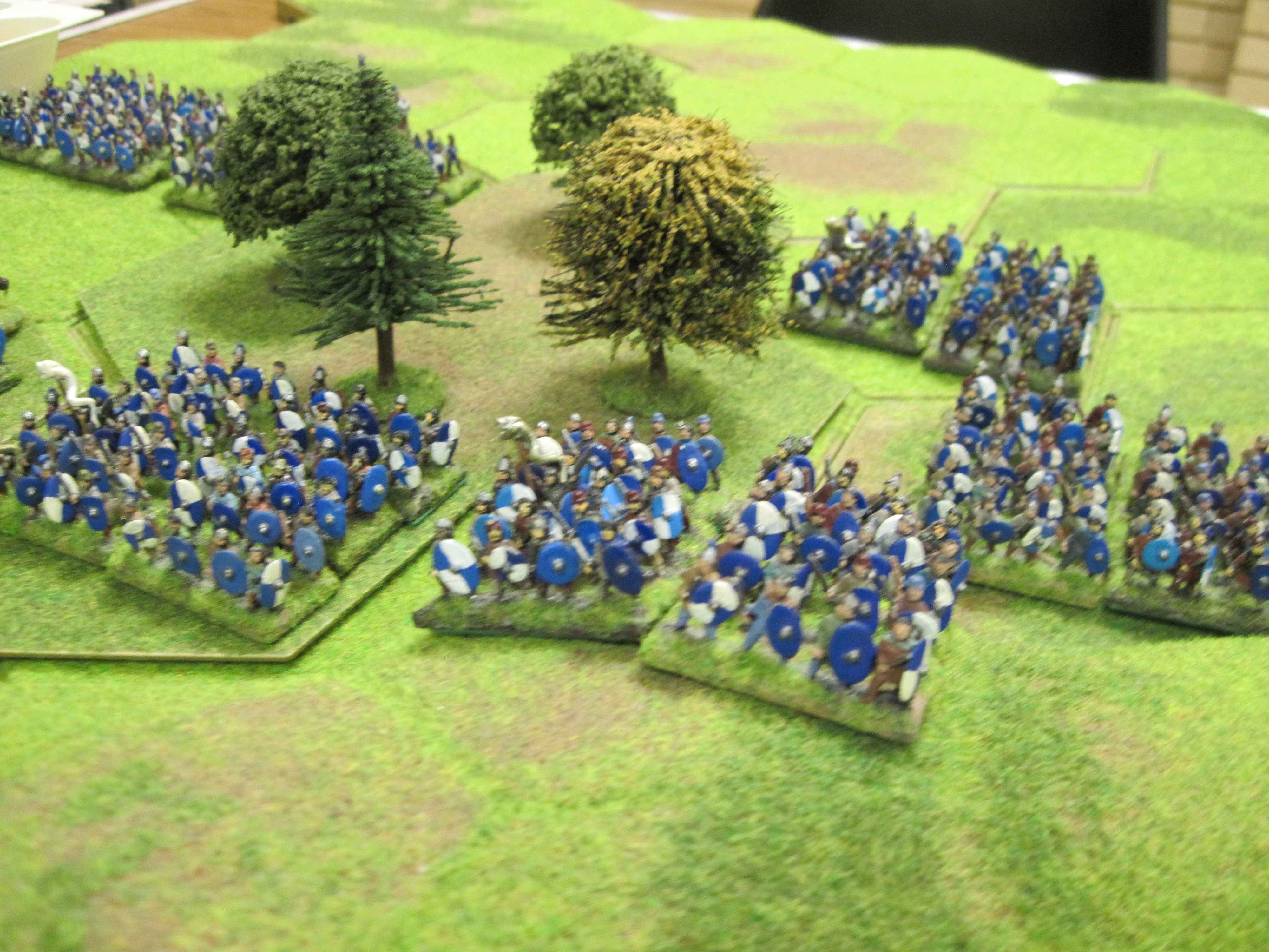 Opening moves saw the Romano-British advance with the warrior hordes of their left wing use there 2 hex movement to close on James on my left who was defending a 4 hex escarpment and a wood with ashigaru and Japanese peasants. This was a major early threat to our left flank. To my right Chris advanced to occupy 2 areas of woodland ready to engage in a shooting battle with Steve’s archers.