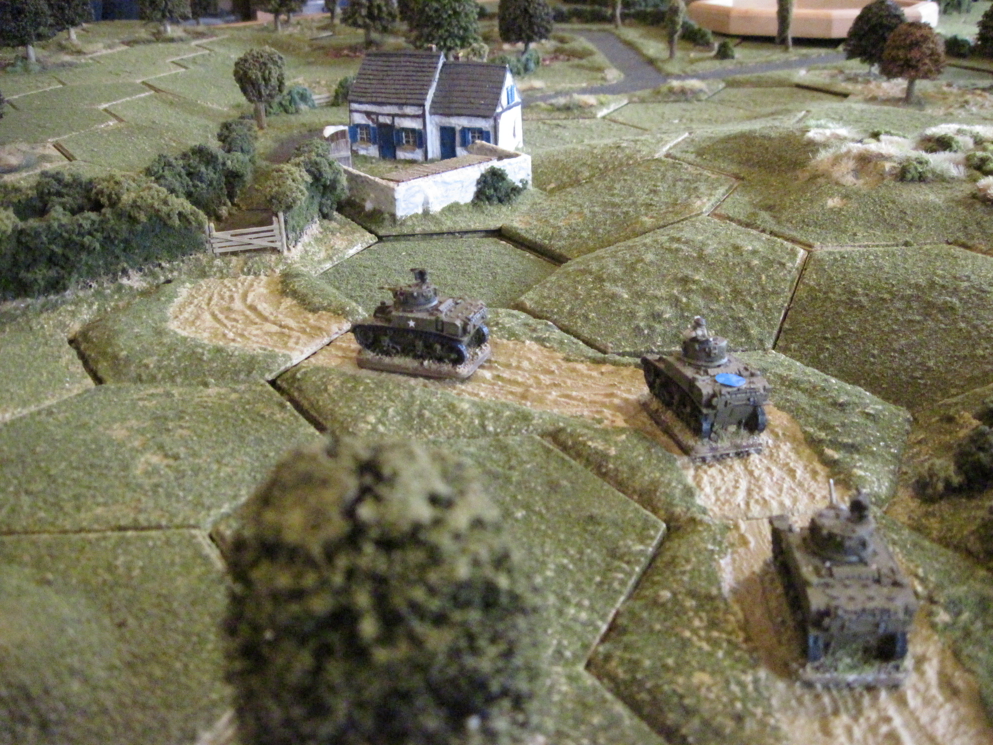 Tony, Dave and Steve were in charge of the Brits as they quickly arrived and advanced towards both villages. The advanced British tanks, instead of advancing into the village, occupied a long, low hill from where they could shoot at the German defenders. The third unit of German infantry took up position in a forest hex adjacent the road which did provide some much needed cover.