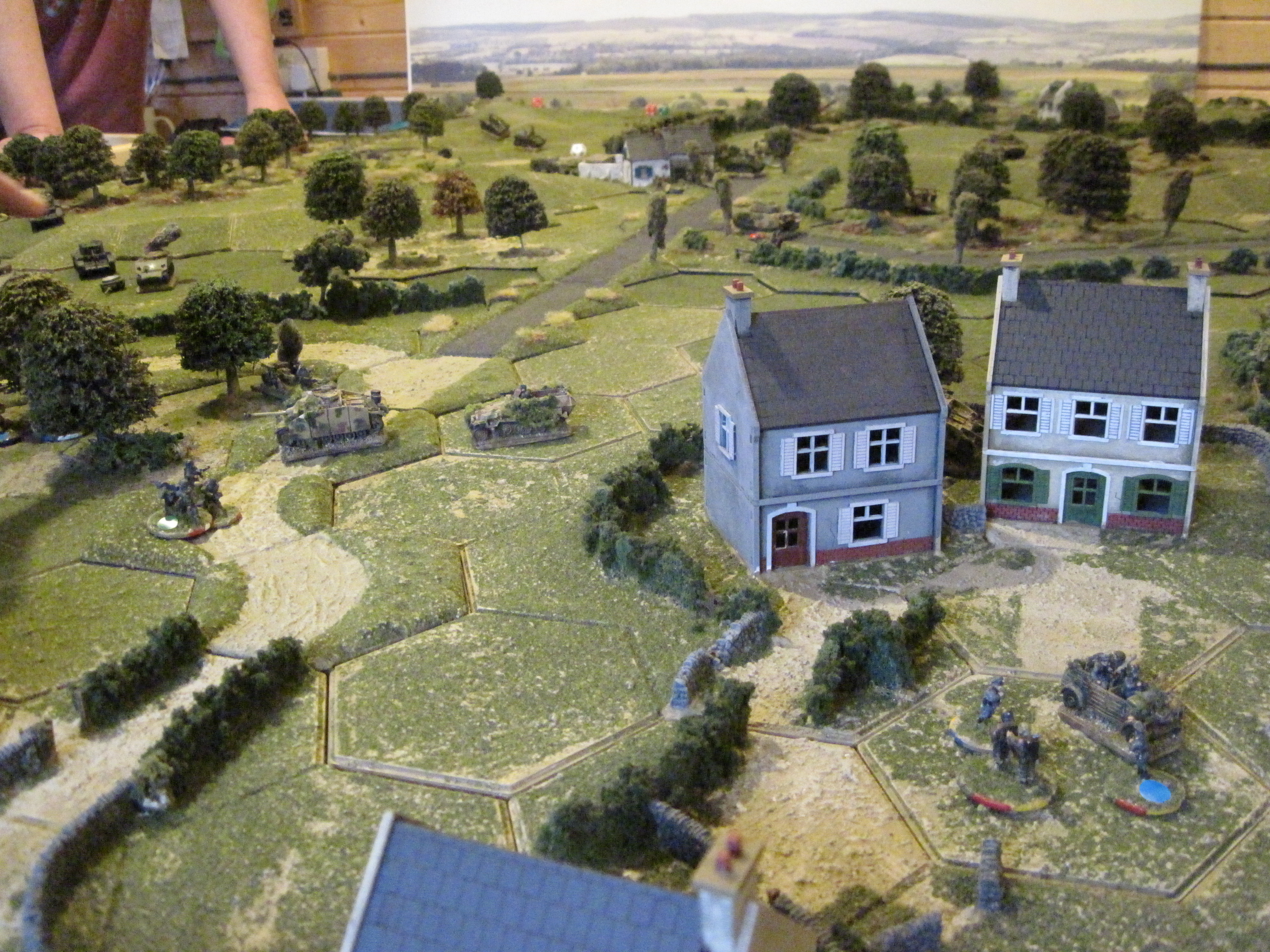 With the experience of the first game the scenario was tweaked a little and Chris and I, now the German defenders, placed our ‘ambush’ units on our hex map. We allocated 3 German infantry sections the task of taking and holding the first village – the same one that the Stuarts had occupied in the first game. Two quick moves and one section was in the house and the other behind the bocage hedge.