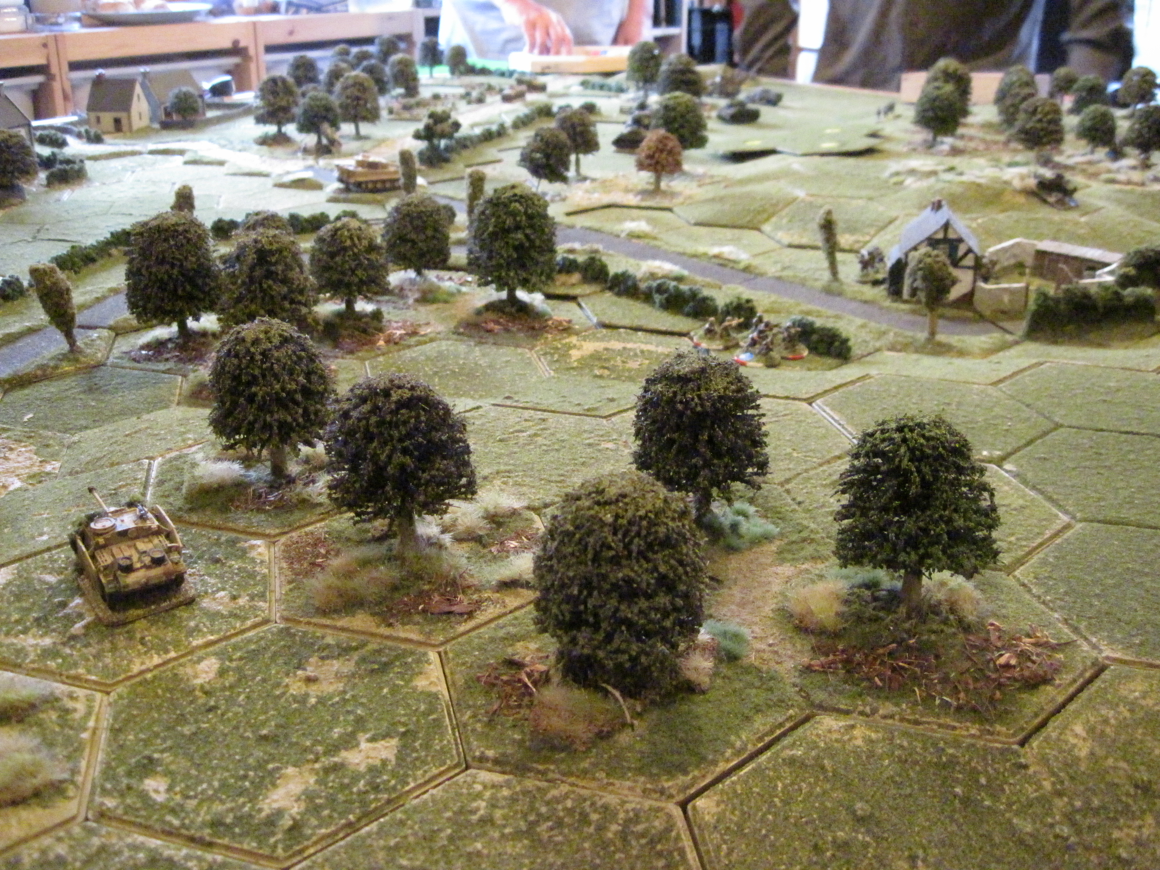Tony, Dave and Steve were in charge of the Brits as they quickly arrived and advanced towards both villages. The advanced British tanks, instead of advancing into the village, occupied a long, low hill from where they could shoot at the German defenders. The third unit of German infantry took up position in a forest hex adjacent the road which did provide some much needed cover.